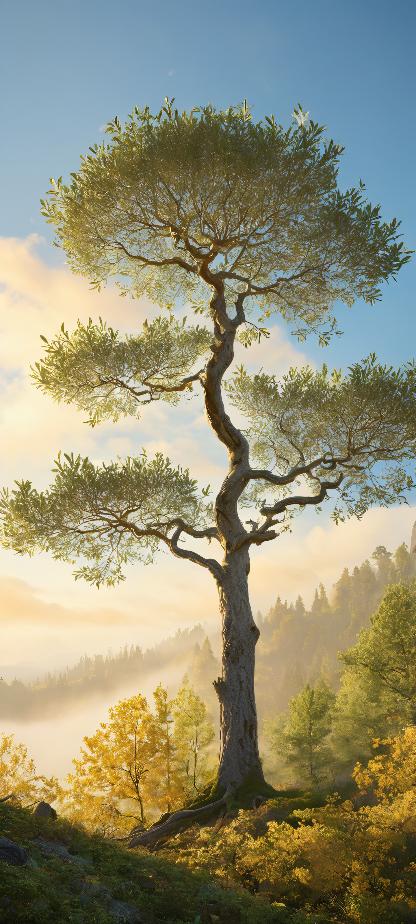 iPhone用に完全に最適化, サムスンギャラクシー, またはAndroidのホーム画面, this breathtaking artwork transports you to an ethereal world. The combination of pristine clarity, intricate micro-details, and ray-traced reflections creates a stunning visual impact that’s simply mesmerizing. Whether it’s dawn or dusk, the soft glow of the setting sun casts a warm light on the forest, inviting you to immerse yourself in its tranquility.