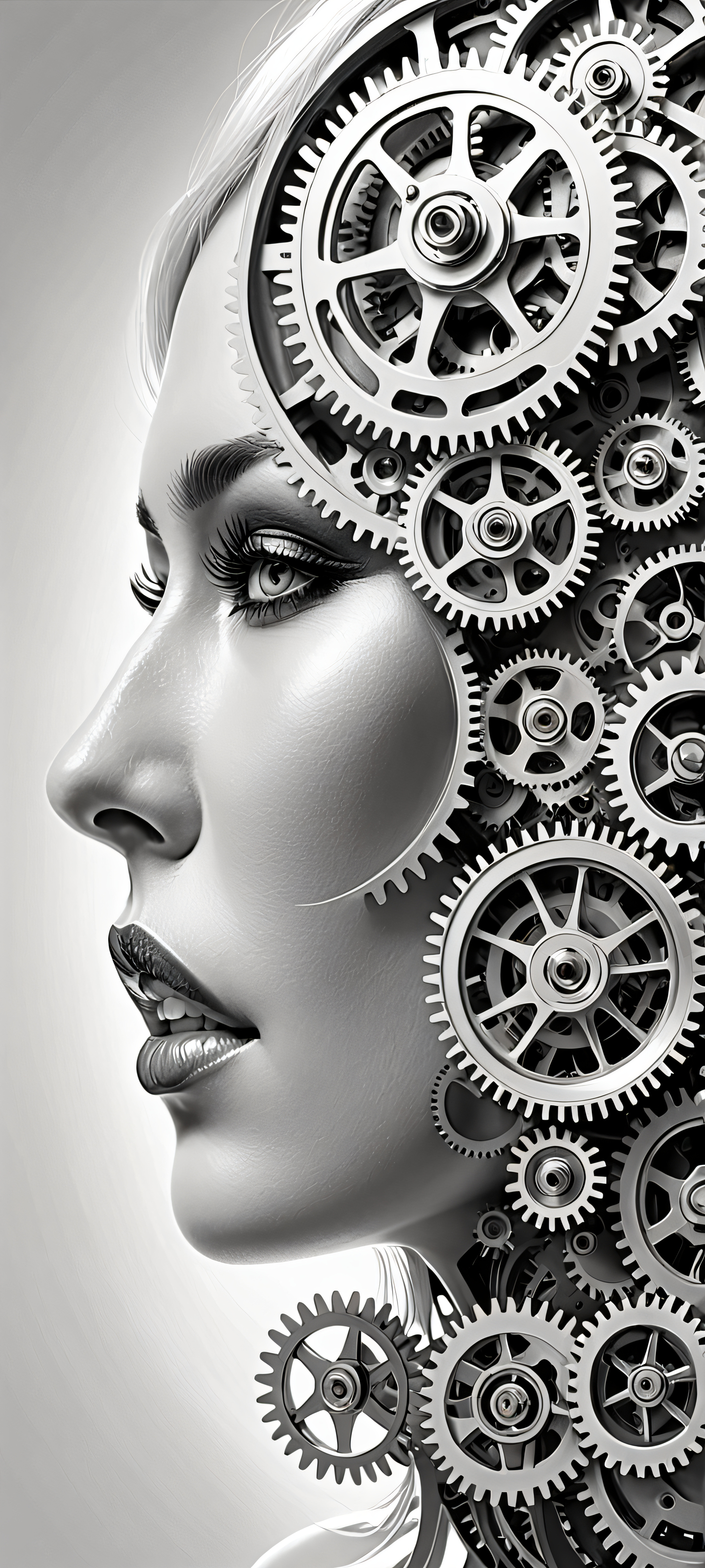 A breathtaking vertical portrait artwork of Delicate mechanical gears placed in the lower-middle, intricate micro-details, Perfectly clean and empty top half with vast pure void, a vast expanse of white space, Award-winning digital art, stunning visual impact, and pristine clarity, Ethereal lighting with soft, radiant highlights and deep, dark shadows that create a sense of depth, Monochromatic palette with subtle shades of gray, from creamy whites to dark charcoal, ethereal lighting, radiant, brilliant colors, ray traced reflections, 原始的な透明度, portrait composition, centered subject in the lower middle, perfectly clean and smooth top half for UI, extreme depth of field blurred background, highly textured surfaces, intricate micro-details, physically based rendering, award-winning digital art, epic breathtaking scale, stunning visual impact, perfect composition, macOS wallpaper aesthetic, masterpiece, 2K QHD resolution, 9:20 aspect ratio.