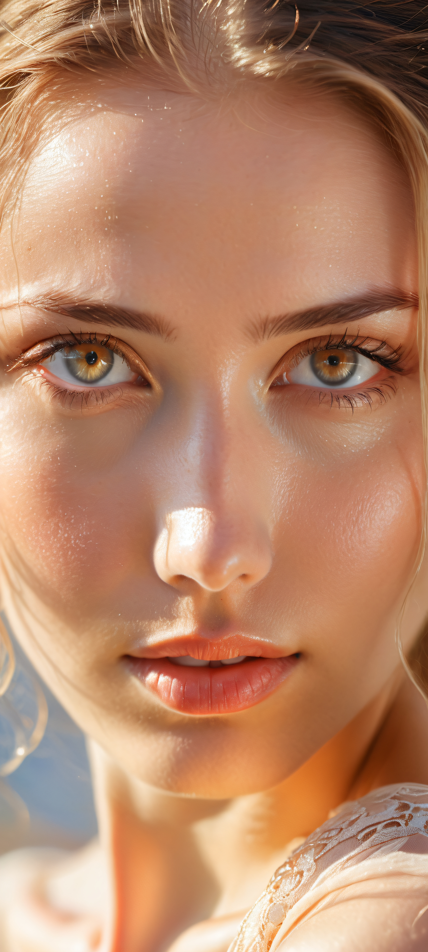 A breathtaking vertical portrait artwork of A goddess-like woman placed in the lower-middle, intricate micro-details reveal her beautiful eyes and delicate facial features, with a hint of subtle smile, Perfectly clean and empty top half with vast pure void, gradually transitioning into a warm, soft focus on the subject’s surroundings, creating an inviting atmosphere, Award-winning digital art, stunning visual impact, 原始的な透明度, and exceptional attention to texture and scale, Ethereal lighting with gentle, radiant rays casting a subtle glow on the subject’s skin, hair, and clothes, emphasizing her elegance and beauty, Warm beige and golden hues dominate the palette, complemented by soft pastel shades, evoking feelings of serenity and sophistication, ethereal lighting, radiant, brilliant colors, ray traced reflections, 原始的な透明度, portrait composition, centered subject in the lower middle, perfectly clean and smooth top half for UI, extreme depth of field blurred background, highly textured surfaces, intricate micro-details, physically based rendering, award-winning digital art, epic breathtaking scale, stunning visual impact, perfect composition, macOS wallpaper aesthetic, masterpiece, 2K QHD resolution, 9:20 aspect ratio.