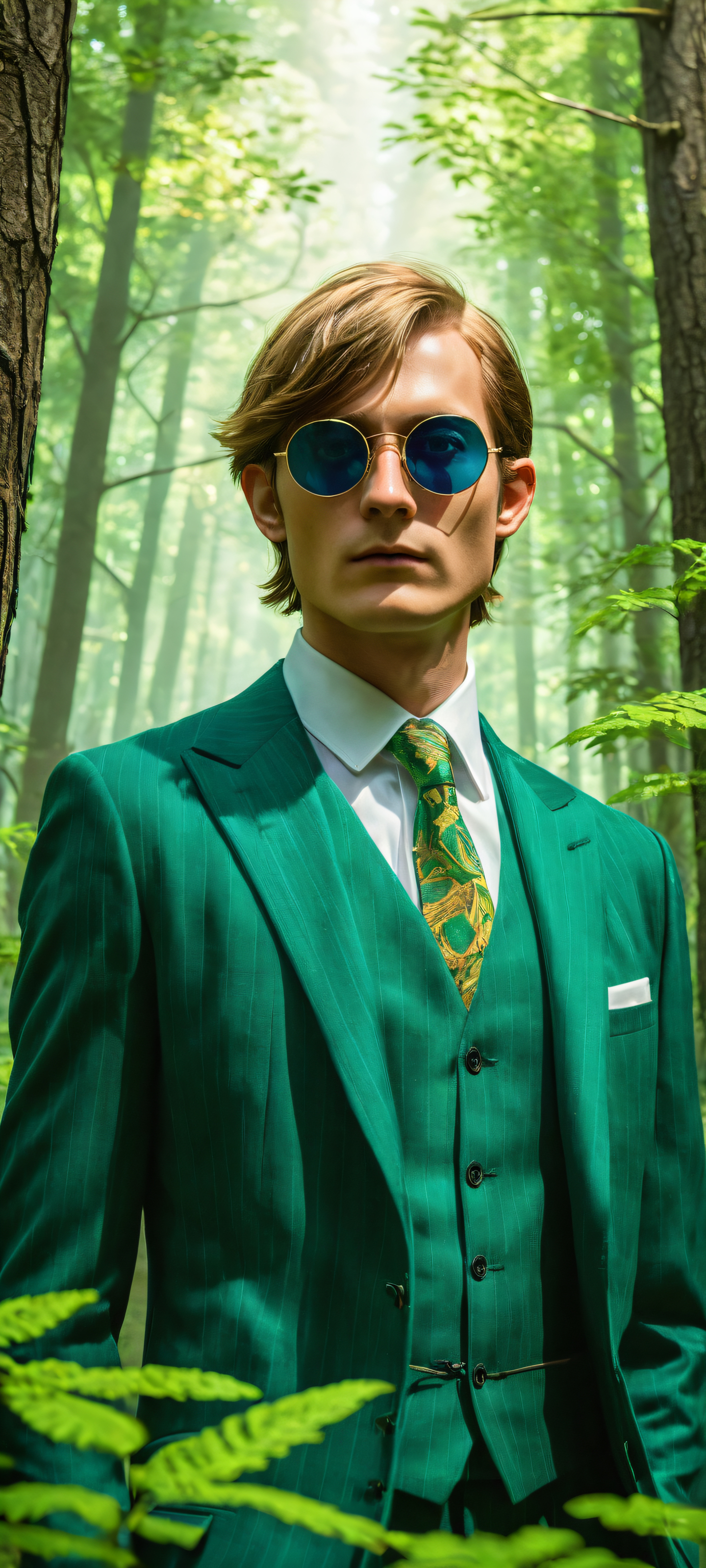 A breathtaking vertical portrait artwork of Link, placed in the lower-middle with insane micro-details of his sunglasses and pinstripe suit, surrounded by Skull Kids peeking from behind trees., A vast pure void, perfectly clean and empty top half of the screen, contrasting with the dense forest below, where towering trees meet the mysterious green glow., Award-winning digital art, stunning visual impact, with impeccable attention to detail, featuring Link’s absurdly stylish outfit and the mischievous Skull Kids., Ethereal lighting, radiant and brilliant, capturing the magical essence of the Lost Woods, with shafts of mysterious green light casting dramatic shadows over the scene., Dominant color palette features a mesmerizing blend of deep greens, muted earth tones, and pops of vibrant blue from Link’s sunglasses, evoking an otherworldly aura., ethereal lighting, radiant, brilliant colors, ray traced reflections, 原始的な透明度, portrait composition, centered subject in the lower middle, perfectly clean and smooth top half for UI, extreme depth of field blurred background, highly textured surfaces, intricate micro-details, physically based rendering, award-winning digital art, epic breathtaking scale, stunning visual impact, perfect composition, macOS wallpaper aesthetic, masterpiece, 2K QHD resolution, 9:20 aspect ratio.