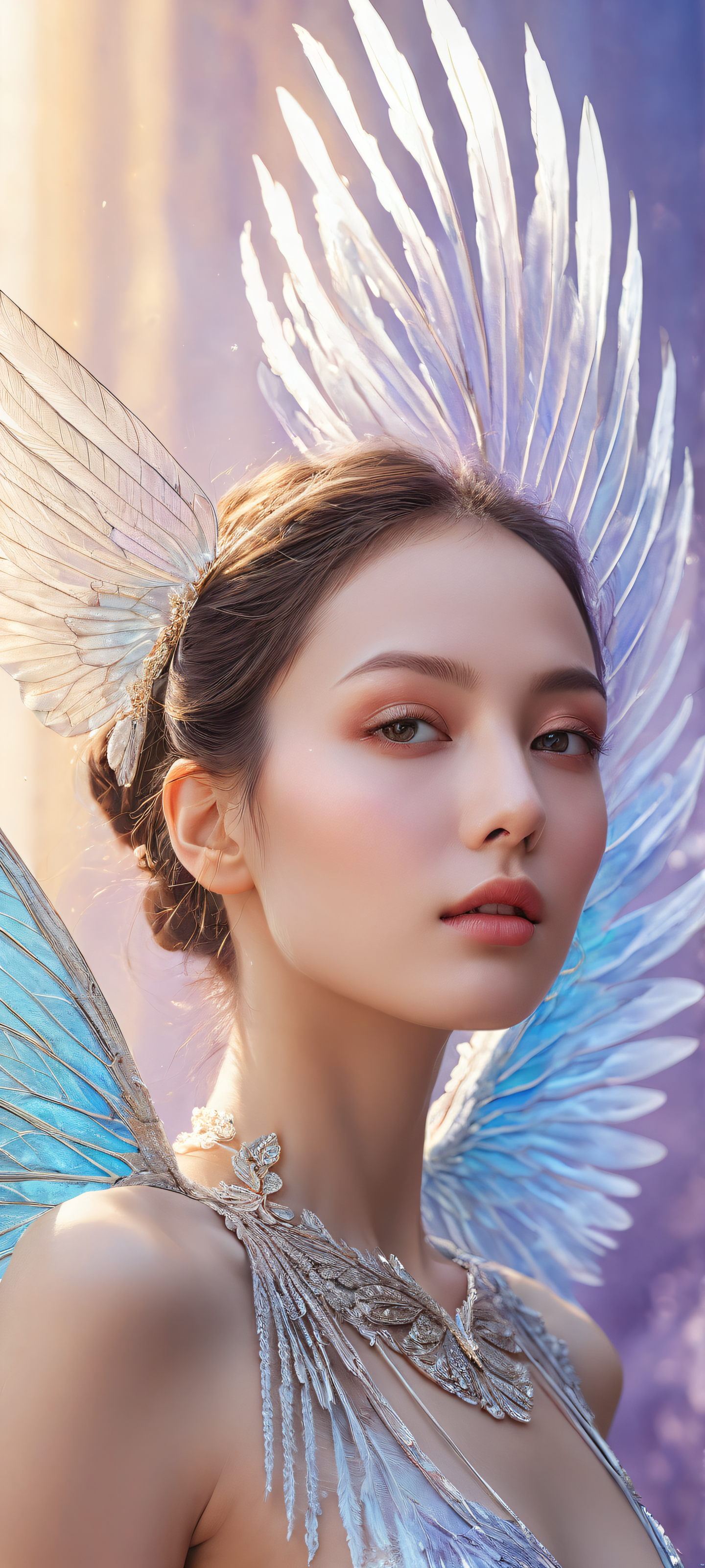 Immerse yourself in this breathtaking digital art masterpiece, あなたのiPhoneに完璧に最適化, サムスンギャラクシー, またはAndroidのホーム画面. The delicate, iridescent wing is placed in the lower-middle, reflecting a deep sense of longing amidst an intricate swirling vortex and pristine clarity.