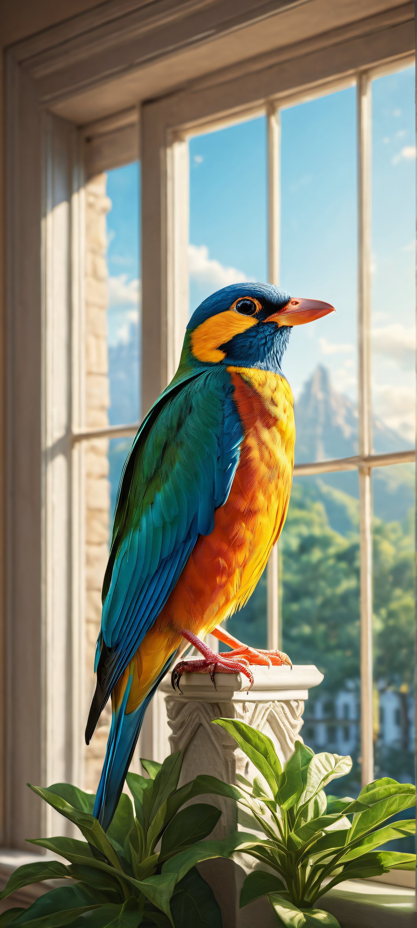 A breathtaking vertical portrait artwork of A majestic bird perched on a windowsill, placed in the lower-middle with insane micro-details, Perfectly clean and empty top half with vast pure void, contrasting with the intricate architecture and lush greenery below, Award-winning digital art, stunning visual impact, and pristine clarity, Ethereal lighting with radiant, brilliant colors, ray-traced reflections, and pristine clarity, simulating a serene morning glow, [‘#C9E4CA’, ‘#8BC34A’, ‘#FFD700’, ‘#3B5320’], ethereal lighting, radiant, brilliant colors, ray traced reflections, 原始的な透明度, portrait composition, centered subject in the lower middle, perfectly clean and smooth top half for UI, extreme depth of field blurred background, highly textured surfaces, intricate micro-details, physically based rendering, award-winning digital art, epic breathtaking scale, stunning visual impact, perfect composition, macOS wallpaper aesthetic, masterpiece, 2K QHD resolution, 9:20 aspect ratio.