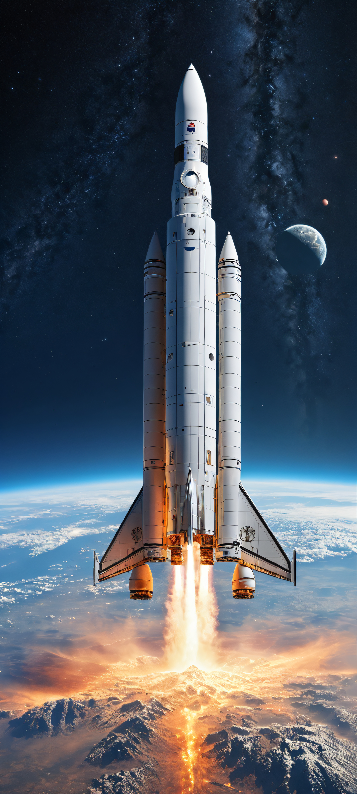 Experience the breathtaking scale of this stunning digital art, あなたのiPhoneに完璧に最適化, サムスンギャラクシー, と Android のホーム画面. The sleek design and precision engineering of the spacecraft are showcased in intricate micro-details, while the top half of the image features a vast pure void, allowing UI widgets to breathe. Ethereal lighting with radiant colors creates a sense of depth and visual impact.