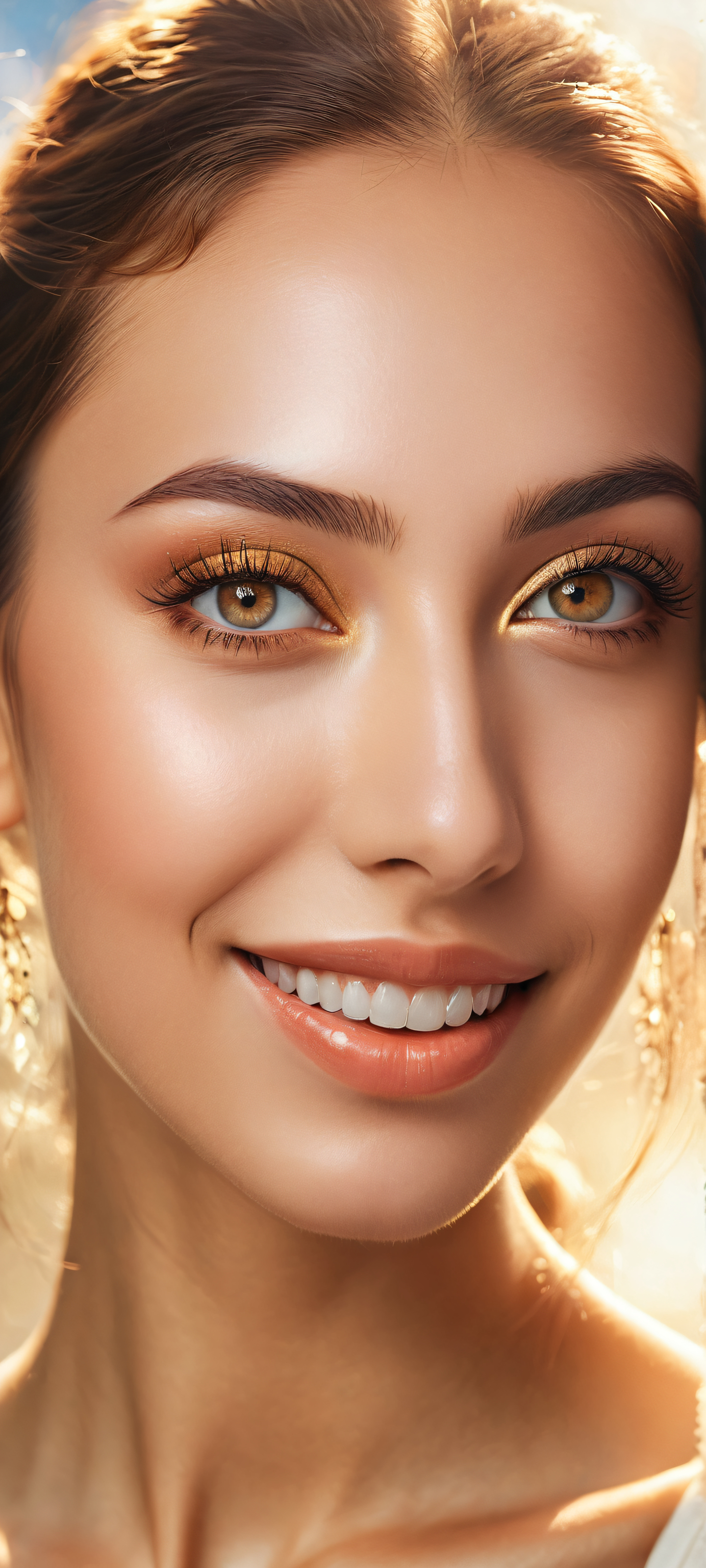 A breathtaking vertical portrait artwork of A young woman with luscious eyelashes and a radiant smile, placed in the lower-middle with insane micro-details., Perfectly clean and empty top half with vast pure void, creating an ethereal atmosphere., Award-winning digital art, stunning visual impact, and pristine clarity., Ethereal softbox lighting with brilliant colors, ray-traced reflections, and flawless luminosity., Dominant brown tones with hints of golden light and creamy whites, evoking a sense of warmth and serenity., ethereal lighting, radiant, brilliant colors, ray traced reflections, 原始的な透明度, portrait composition, centered subject in the lower middle, perfectly clean and smooth top half for UI, extreme depth of field blurred background, highly textured surfaces, intricate micro-details, physically based rendering, award-winning digital art, epic breathtaking scale, stunning visual impact, perfect composition, macOS wallpaper aesthetic, masterpiece, 2K QHD resolution, 9:20 aspect ratio.