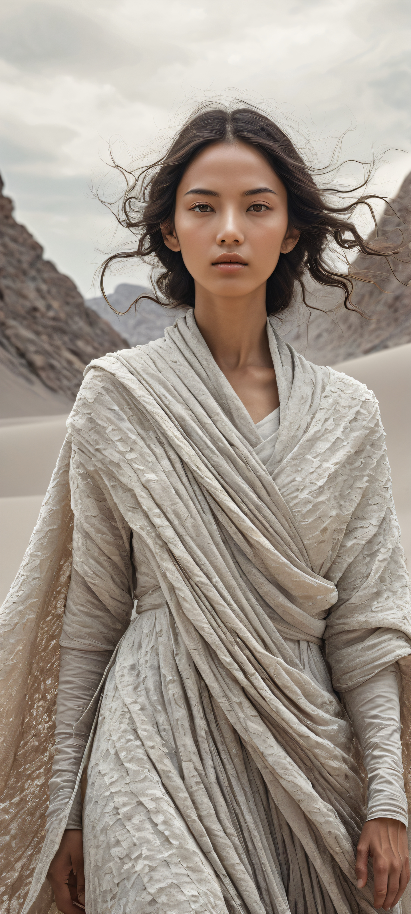 A breathtaking vertical portrait artwork of A figure, placed in the lower-middle, intricate micro-details, covered in ash-like layered fabric, with edges crumbling into particles, Standing in an open barren land, perfectly clean and empty top half with vast pure void, Award-winning digital art, stunning visual impact, 原始的な透明度, reminiscent of Ghibli-inspired anime style, Ethereal softbox lighting with radiant, brilliant colors, ray-traced reflections, and impeccable clarity, as if the scene is bathed in a gentle, otherworldly glow, Desaturated tones of muted grays, whites, and creams, punctuated by subtle hints of ash-like texture, ethereal lighting, radiant, brilliant colors, ray traced reflections, 原始的な透明度, portrait composition, centered subject in the lower middle, perfectly clean and smooth top half for UI, extreme depth of field blurred background, highly textured surfaces, intricate micro-details, physically based rendering, award-winning digital art, epic breathtaking scale, stunning visual impact, perfect composition, macOS wallpaper aesthetic, masterpiece, 2K QHD resolution, 9:20 aspect ratio.