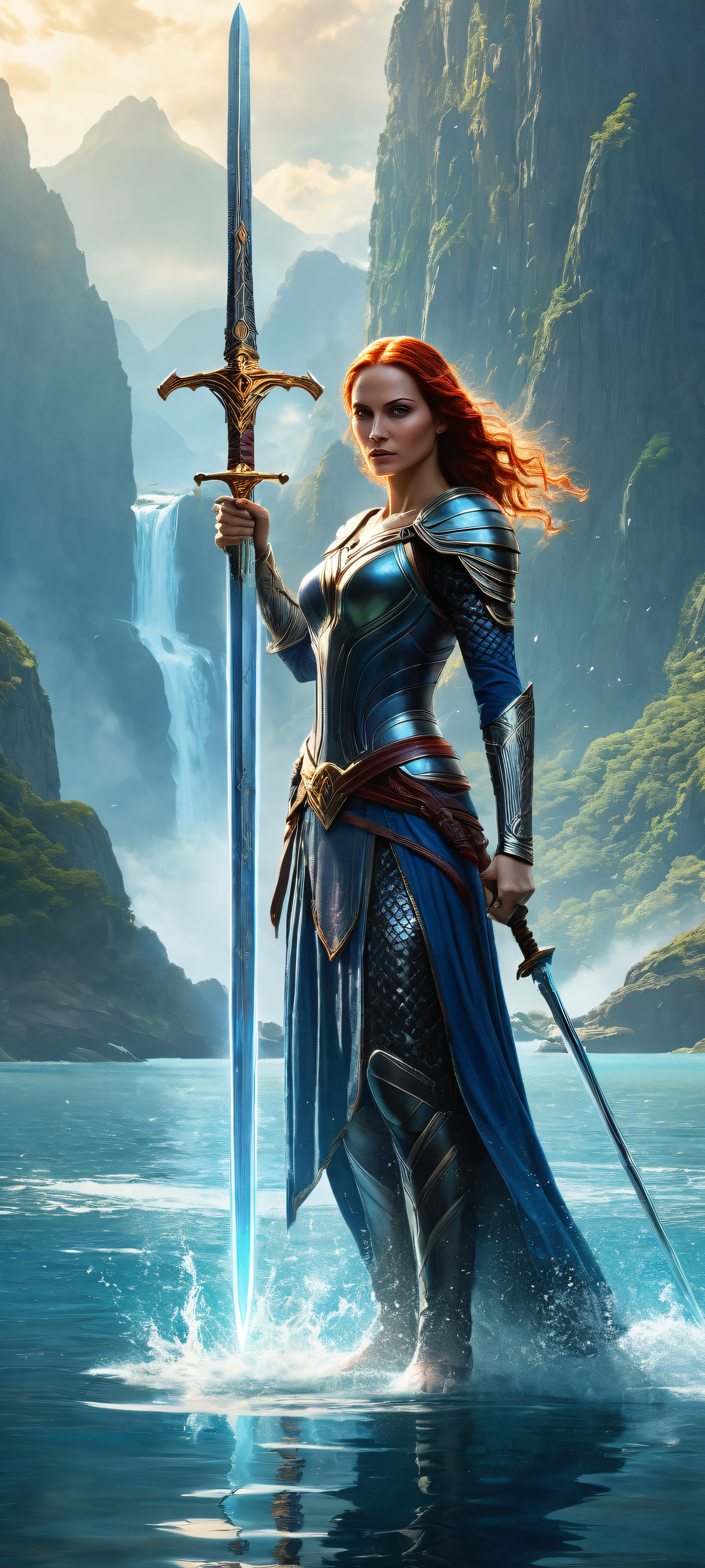 A breathtaking vertical portrait artwork of A heroic woman wielding a glowing sword, placed in the lower-middle with insane micro-details, such as intricate armor designs and subtle water effects., Perfectly clean and empty top half with vast pure void, allowing for a clear view of the subject, while the bottom half features a serene and mystical water reflection., Award-winning digital art, 原始的な透明度, boasting breathtaking 8k resolution and masterful rendering of textures and scale to match Apple UI standards., エーテル的, radiant lighting with subtle glow effects emanating from the sword, reflecting off the water’s surface, and casting an atmospheric ambiance that immerses the viewer., A dominant palette of soothing blues and purples, complemented by warm golden hues, evoking a sense of mystique and wonder., ethereal lighting, radiant, brilliant colors, ray traced reflections, 原始的な透明度, portrait composition, centered subject in the lower middle, perfectly clean and smooth top half for UI, extreme depth of field blurred background, highly textured surfaces, intricate micro-details, physically based rendering, award-winning digital art, epic breathtaking scale, stunning visual impact, perfect composition, macOS wallpaper aesthetic, masterpiece, 2K QHD resolution, 9:20 aspect ratio.