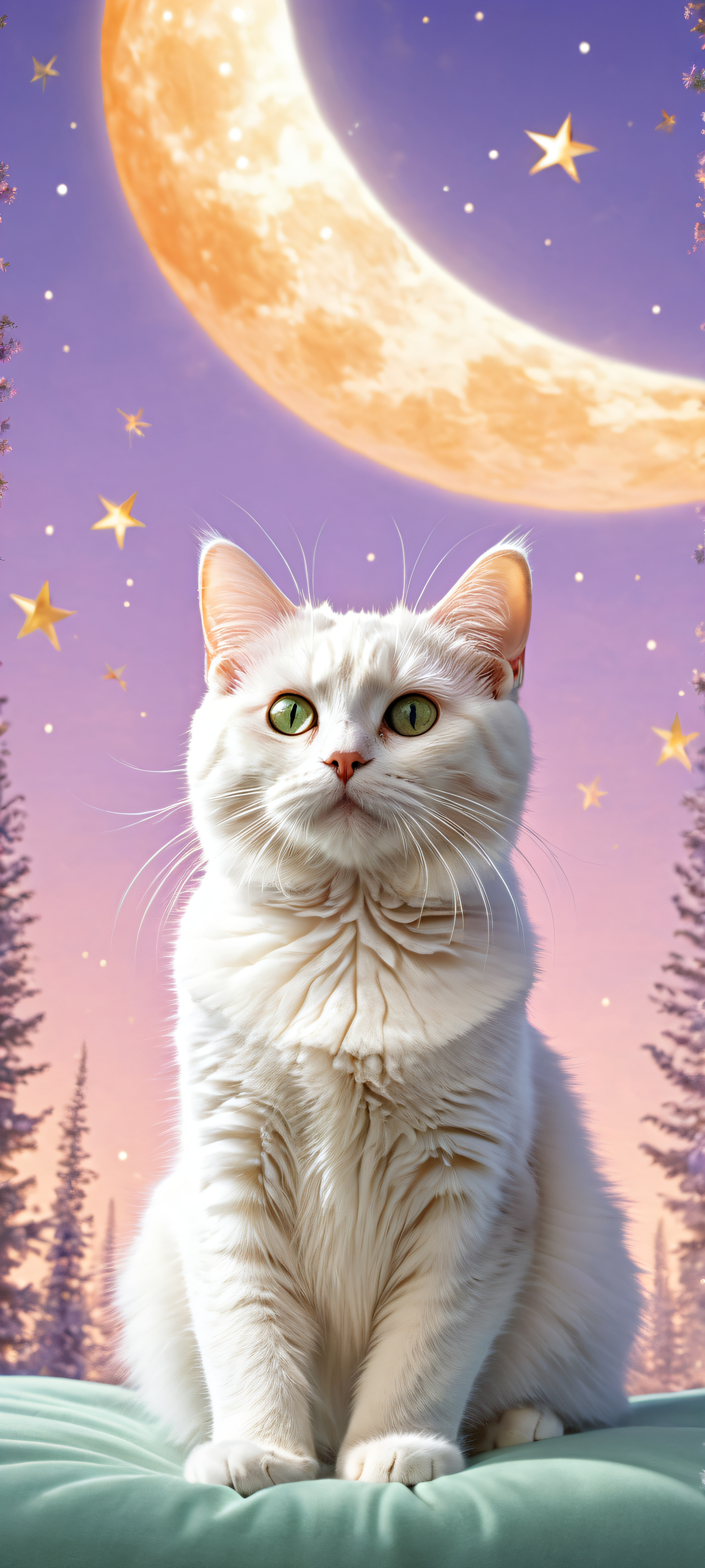 A breathtaking vertical portrait artwork of A dreamy kitten outline, placed in the lower-middle with insane micro-details, featuring a crescent moon inner body, white fluffy clouds, and gold-dusted shooting stars leaving trails of lights behind., A perfectly clean and empty top half with vast pure void, allowing for seamless UI placement, while the lower-middle features a photorealistic background of soft fuzzy cat bed, complete with bold vibrant colors., Award-winning digital art, stunning visual impact, and pristine clarity, showcasing exceptional mastery of color and composition, Ethereal lighting with radiant, brilliant colors, ray-traced reflections, and pristine clarity, creating an otherworldly ambiance that draws the viewer in, A palette dominated by pastel hues of lavender, peach, and mint green, with accents of gold and white, evoking a sense of magic and wonder, ethereal lighting, radiant, brilliant colors, ray traced reflections, 原始的な透明度, portrait composition, centered subject in the lower middle, perfectly clean and smooth top half for UI, extreme depth of field blurred background, highly textured surfaces, intricate micro-details, physically based rendering, award-winning digital art, epic breathtaking scale, stunning visual impact, perfect composition, macOS wallpaper aesthetic, masterpiece, 2K QHD resolution, 9:20 aspect ratio.
