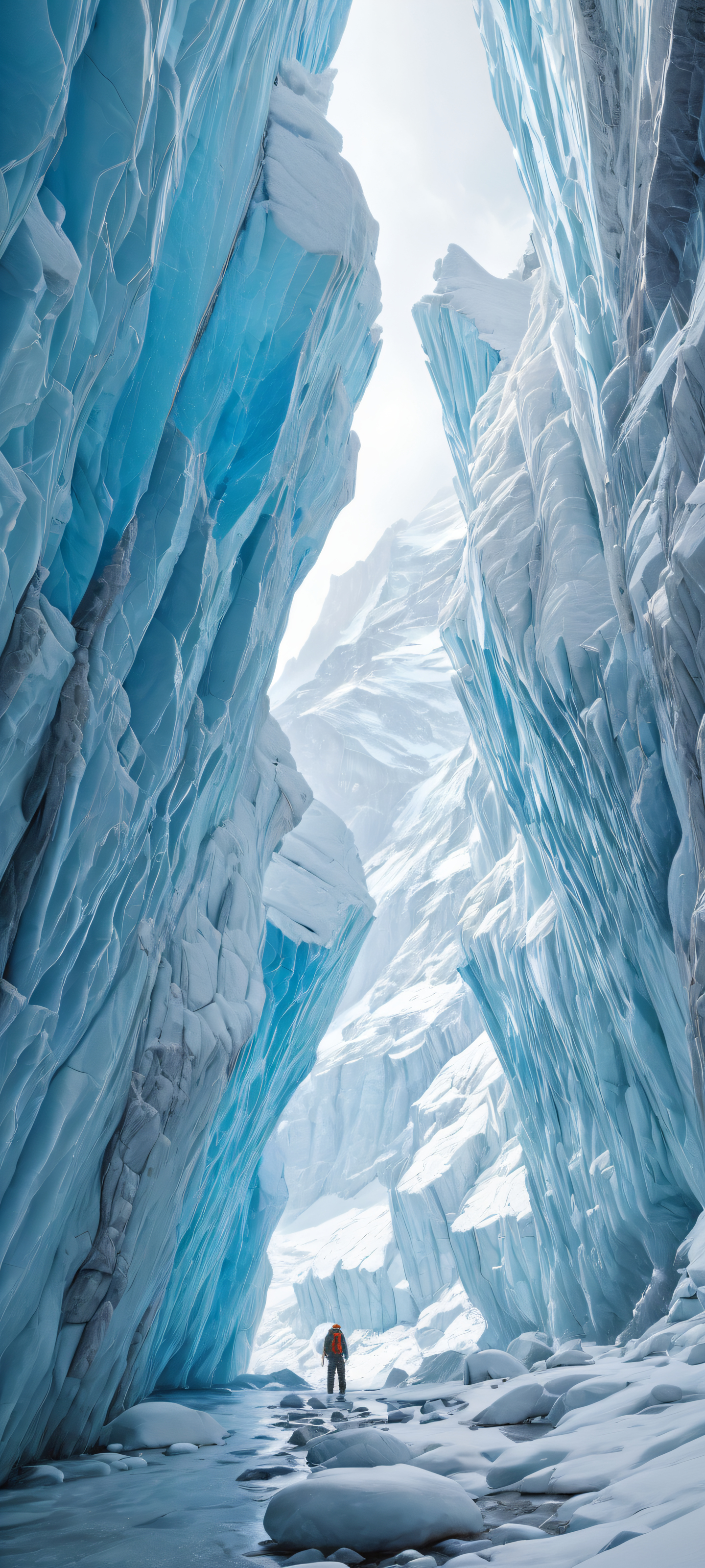 A breathtaking vertical portrait artwork of Glaciers placed in the lower-middle with intricate micro-details of stone and glacier formations., Perfectly clean and empty top half with vast pure void, contrasting with the prairie rainstorm in the background., Award-winning digital art, 原始的な透明度, and stunning visual impact., Ethereal lighting with radiant, brilliant colors, ray-traced reflections, and perfect clarity, evoking a sense of serenity and wonder., [‘#FFFFFF’, ‘#43A047’, ‘#8BC34A’], ethereal lighting, radiant, brilliant colors, ray traced reflections, 原始的な透明度, portrait composition, centered subject in the lower middle, perfectly clean and smooth top half for UI, extreme depth of field blurred background, highly textured surfaces, intricate micro-details, physically based rendering, award-winning digital art, epic breathtaking scale, stunning visual impact, perfect composition, macOS wallpaper aesthetic, masterpiece, 2K QHD resolution, 9:20 aspect ratio.