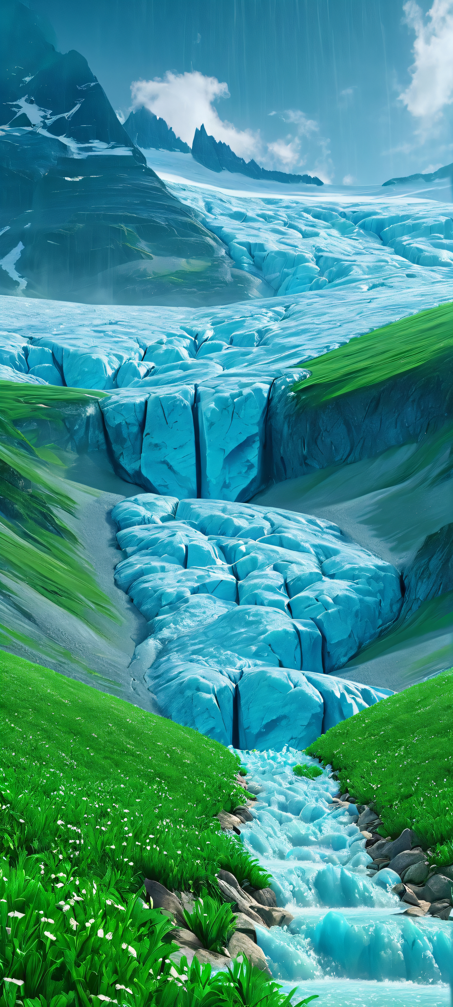 Escape to a breathtaking vertical mobile phone wallpaper that perfectly captures the majesty of glaciers. This masterpiece is optimized for your iPhone, サムスンギャラクシー, と Android のホーム画面, ensuring a stunning visual experience. The combination of realistic glacier details, misty rain, and lush green prairie creates an immersive atmosphere.