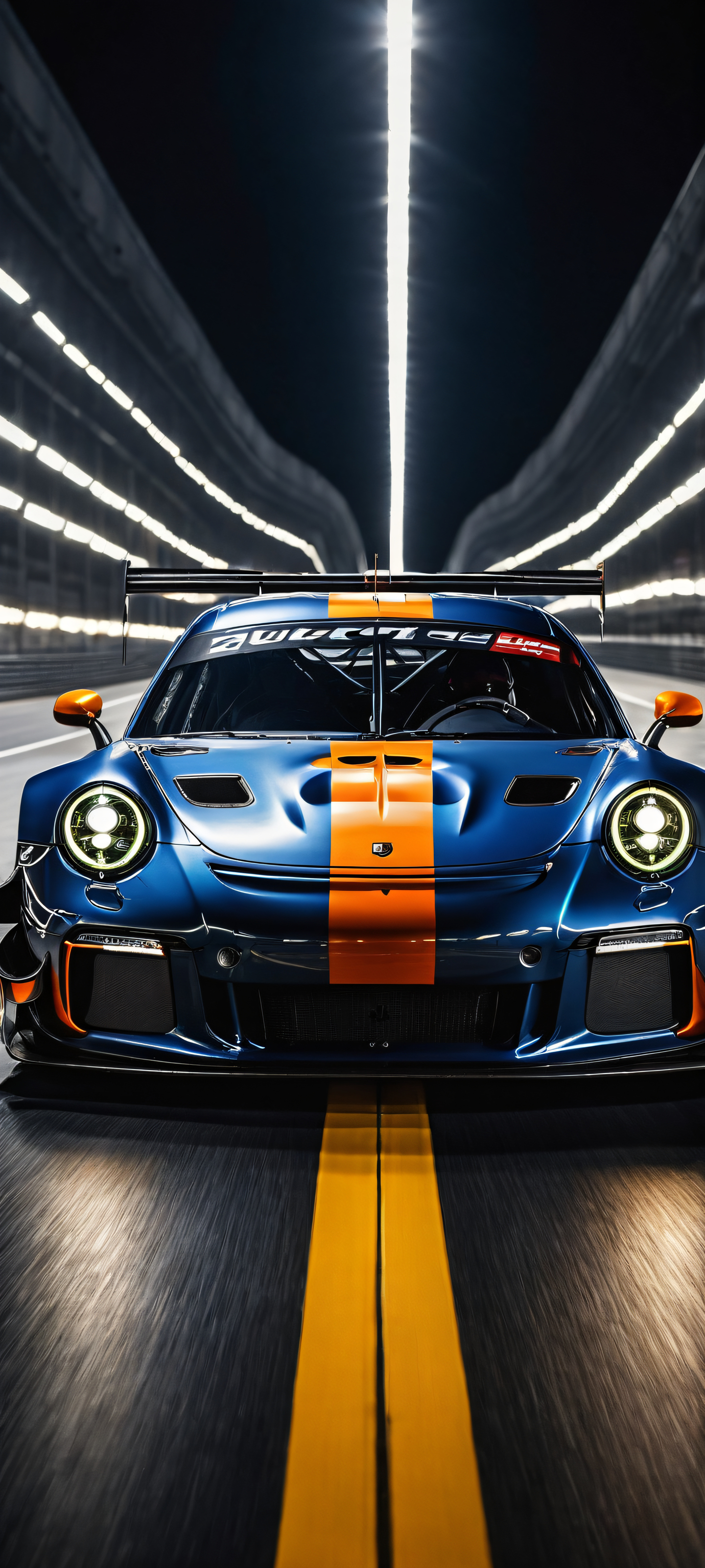 A breathtaking vertical portrait artwork of High-performance GT3 racing car placed in the lower-middle with intricate micro-details, showcasing its sleek design and aggressive stance., A perfectly clean and empty top half with vast pure void, allowing the racing car to take center stage against the darkened Monza Circuit backdrop at night., Award-winning digital art, 原始的な透明度, and precision-crafted visual effects to create a truly stunning masterpiece., Deep, perfect blacks dominate the scene, punctuated by the bright, piercing headlights of the GT3 racing car, creating a striking contrast that draws the viewer’s eye., Dominant colors include deep blues and purples, accented with warm orange and yellow hues from the headlights, evoking a sense of high-speed excitement and tension., elegant low-key lighting, deep perfect blacks, striking contrast, sleek dark mode aesthetic, luminescent accents, deep rich colors, portrait composition, centered subject in the lower middle, perfectly clean and smooth top half for UI, extreme depth of field blurred background, highly textured surfaces, intricate micro-details, physically based rendering, award-winning digital art, epic breathtaking scale, stunning visual impact, perfect composition, macOS wallpaper aesthetic, masterpiece, 2K QHD resolution, 9:20 aspect ratio.