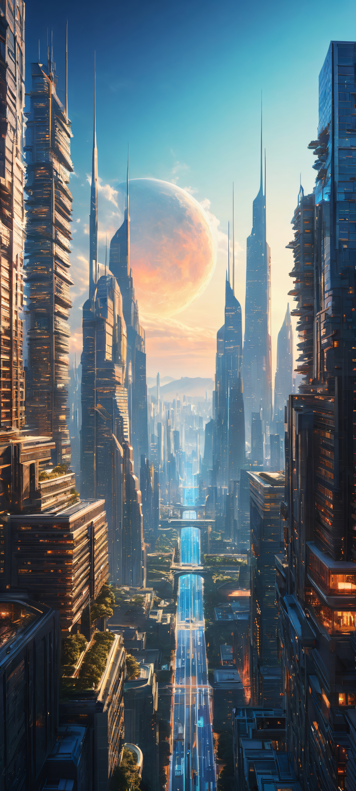 A breathtaking vertical portrait artwork of A celestial being placed in the lower-middle, intricate micro-details of a futuristic cityscape., Perfectly clean and empty top half with vast pure void, giving way to a dark and gritty urban landscape below, replete with neon lights and futuristic architecture., Award-winning digital art with stunning visual impact, perfectly capturing the essence of cksc’s style, and featuring pristine clarity., Ethereal lighting casts an otherworldly glow on the cityscape, with ray traced reflections adding depth and dimensionality to the scene., [‘#4C51B7’, ‘#FF8F71’, ‘#C0C0C0’], ethereal lighting, radiant, brilliant colors, ray traced reflections, 原始的な透明度, portrait composition, centered subject in the lower middle, perfectly clean and smooth top half for UI, extreme depth of field blurred background, highly textured surfaces, intricate micro-details, physically based rendering, award-winning digital art, epic breathtaking scale, stunning visual impact, perfect composition, macOS wallpaper aesthetic, masterpiece, 2K QHD resolution, 9:20 aspect ratio.
