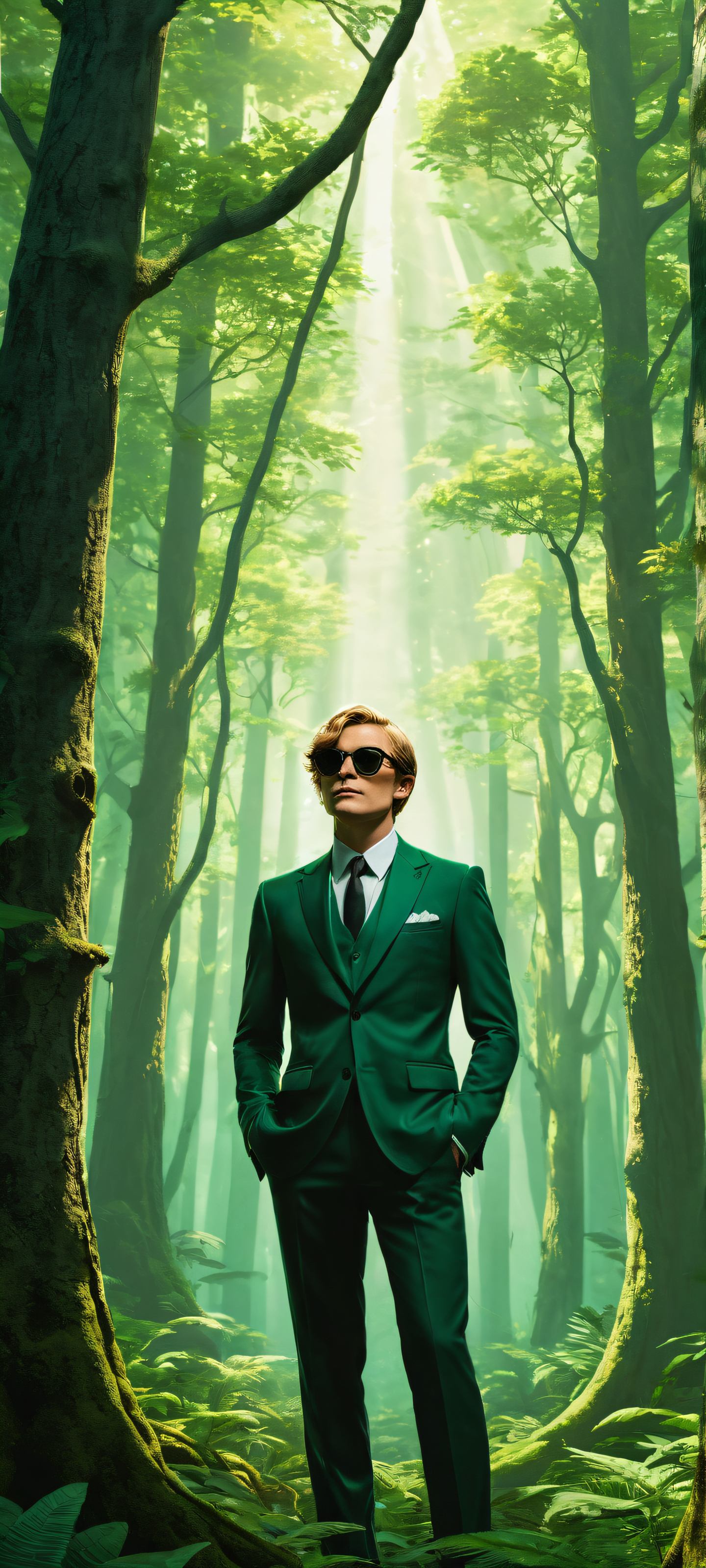 A breathtaking vertical portrait artwork of Link placed in the lower-middle, wearing sunglasses and pinstripe suit, surrounded by intricate micro-details of Skull Kids peeking from behind trees, snickering., Perfectly clean and empty top half with vast pure void, below it the Lost Woods forest canopy stretches out in a sea of mysterious green light., Award-winning digital art, 原始的な透明度, with a hint of surrealism and playfulness., Deep perfect blacks, striking crisp contrast between Link’s outfit and the surrounding environment, with elegant luminescent accents from the green shafts of light., #8B9467 (Earthly tones of green), #333333 (Deep black), and #66CC00 (Vibrant green) – a palette that captures the whimsical essence of Civitai’s surreal world., elegant low-key lighting, deep perfect blacks, striking contrast, sleek dark mode aesthetic, luminescent accents, deep rich colors, portrait composition, centered subject in the lower middle, perfectly clean and smooth top half for UI, extreme depth of field blurred background, highly textured surfaces, intricate micro-details, physically based rendering, award-winning digital art, epic breathtaking scale, stunning visual impact, perfect composition, macOS wallpaper aesthetic, masterpiece, 2K QHD resolution, 9:20 aspect ratio.
