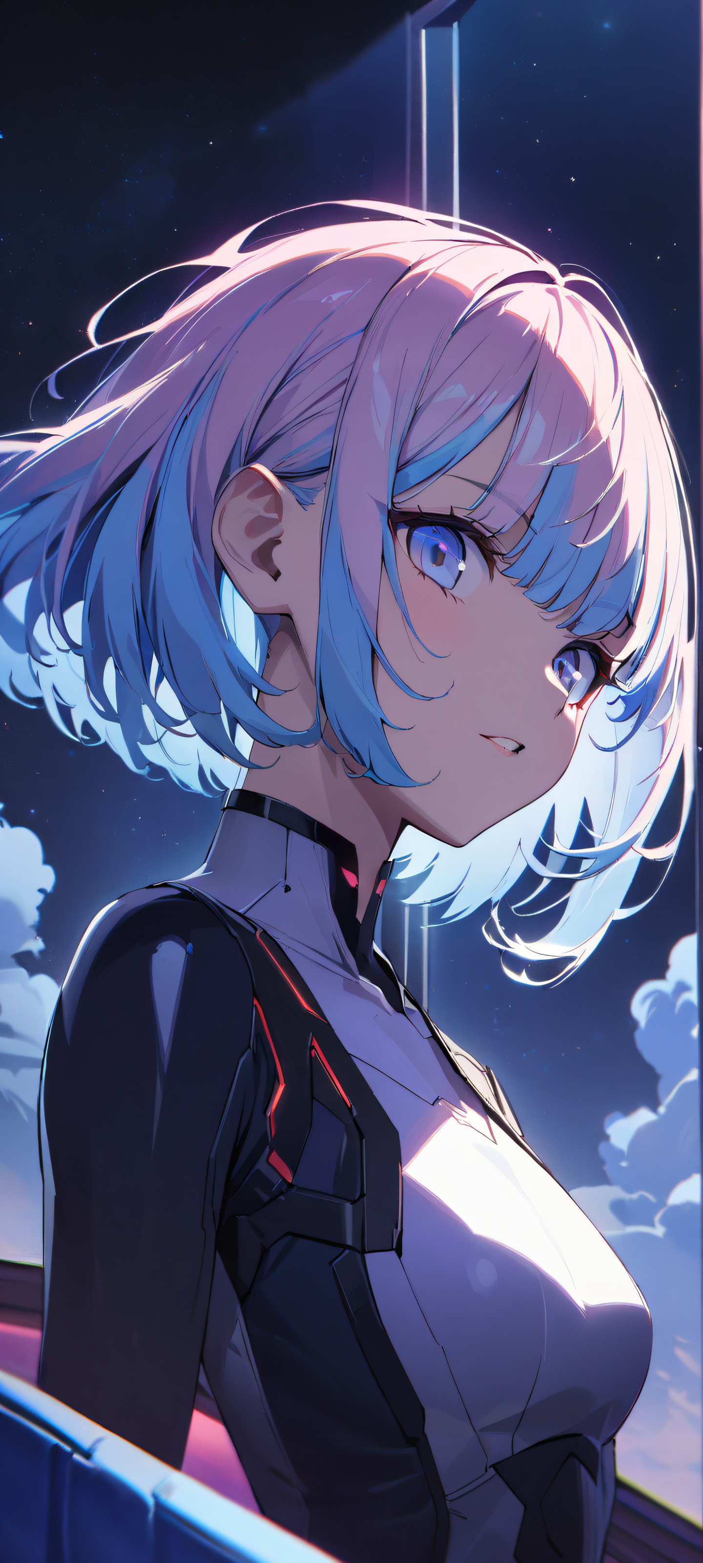 1girl, lucy, cyberpunk edgerunners, solo, masterpiece, best quality, very aesthetic, absurdres, highly detailed, looking at viewer, portrait composition, centered subject in the lower middle, perfectly clean and smooth top half for UI, A perfectly clean and empty top half with a vast pure void, giving way to a breathtaking sky with clouds, creating a sense of depth and wonder., Dominant palette featuring a range of blues and whites, evoking the feeling of a clear night sky, with subtle hints of warmth from Qifrey’s presence, elegant low-key lighting, striking contrast, deep perfect blacks, night scene, glowing lights, dramatic shadows