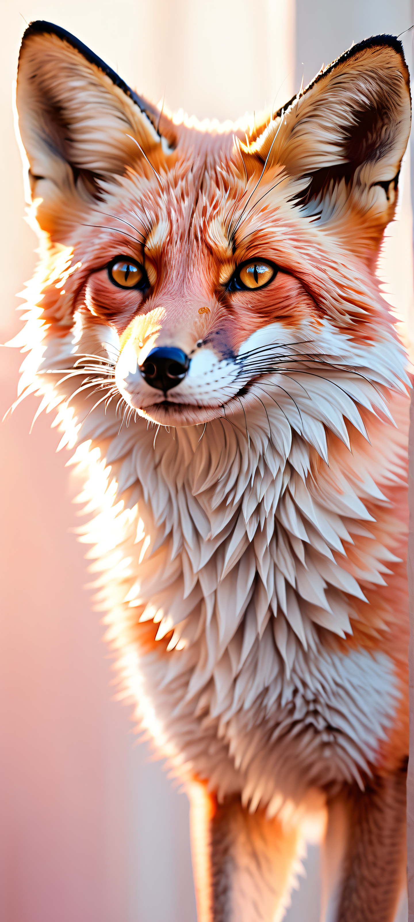 A breathtaking vertical portrait artwork of In a lush valley surrounded by towering trees, a majestic fox sanctuary unfolds like a canvas of golden light, with wispy clouds drifting lazily across the sky as sunset approaches; the rolling hillsides are adorned with wildflowers swaying gently in the breeze, while a meandering stream babbles softly beneath ancient willows, their gnarled branches stretching towards the heavens like nature’s own sculptures., portrait composition, centered subject in the lower middle, perfectly clean and smooth top half for UI, extreme depth of field blurred background, highly textured surfaces, intricate micro-details, physically based rendering, award-winning digital art, masterpiece, 2K QHD resolution, 9:20 aspect ratio