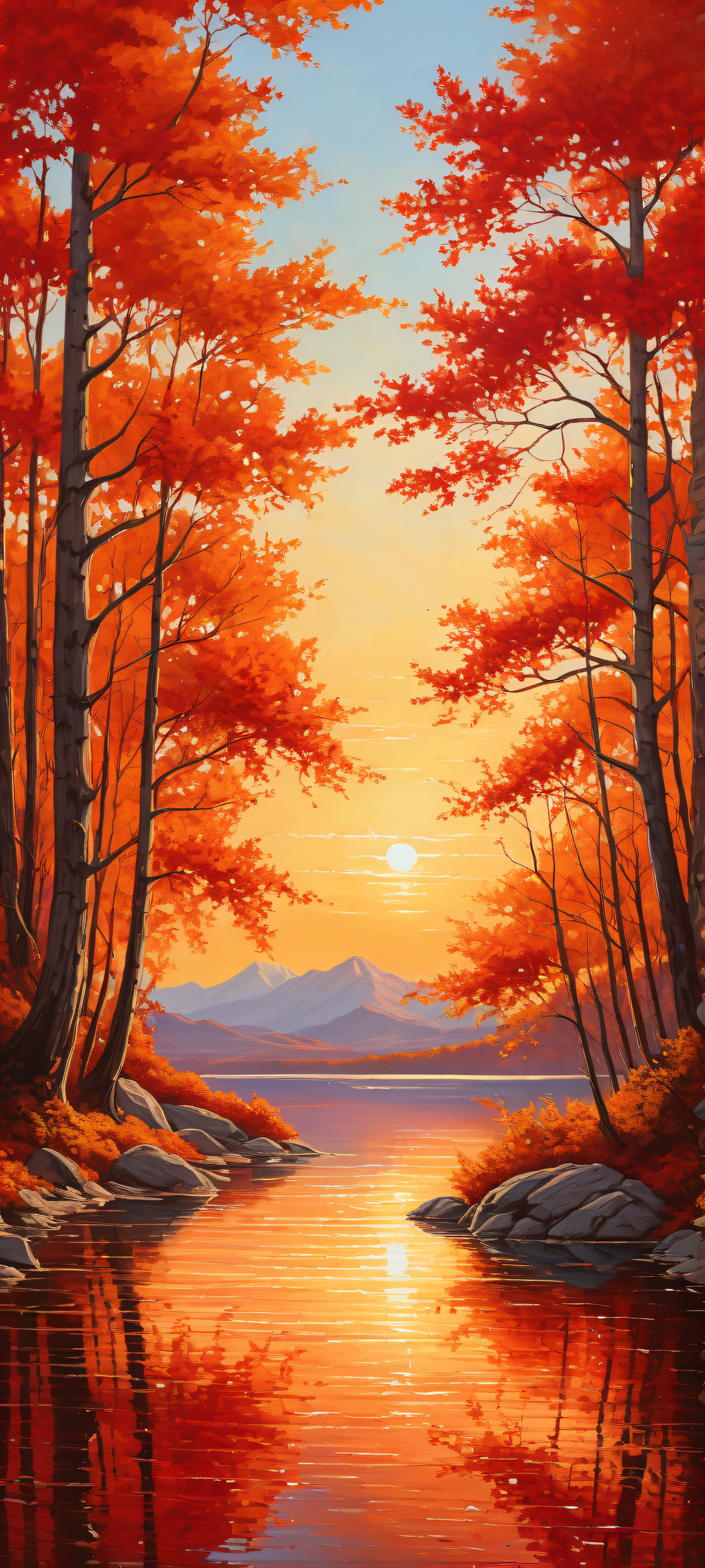 Immerse yourself in this breathtaking digital art piece, あなたのiPhoneに完璧に最適化, サムスンギャラクシー, またはAndroidのホーム画面. The serene atmosphere of the lower-middle placed portrait is complemented by the crisp fall air and vibrant red and orange foliage carpeting the ground, creating a sense of calm contemplation.