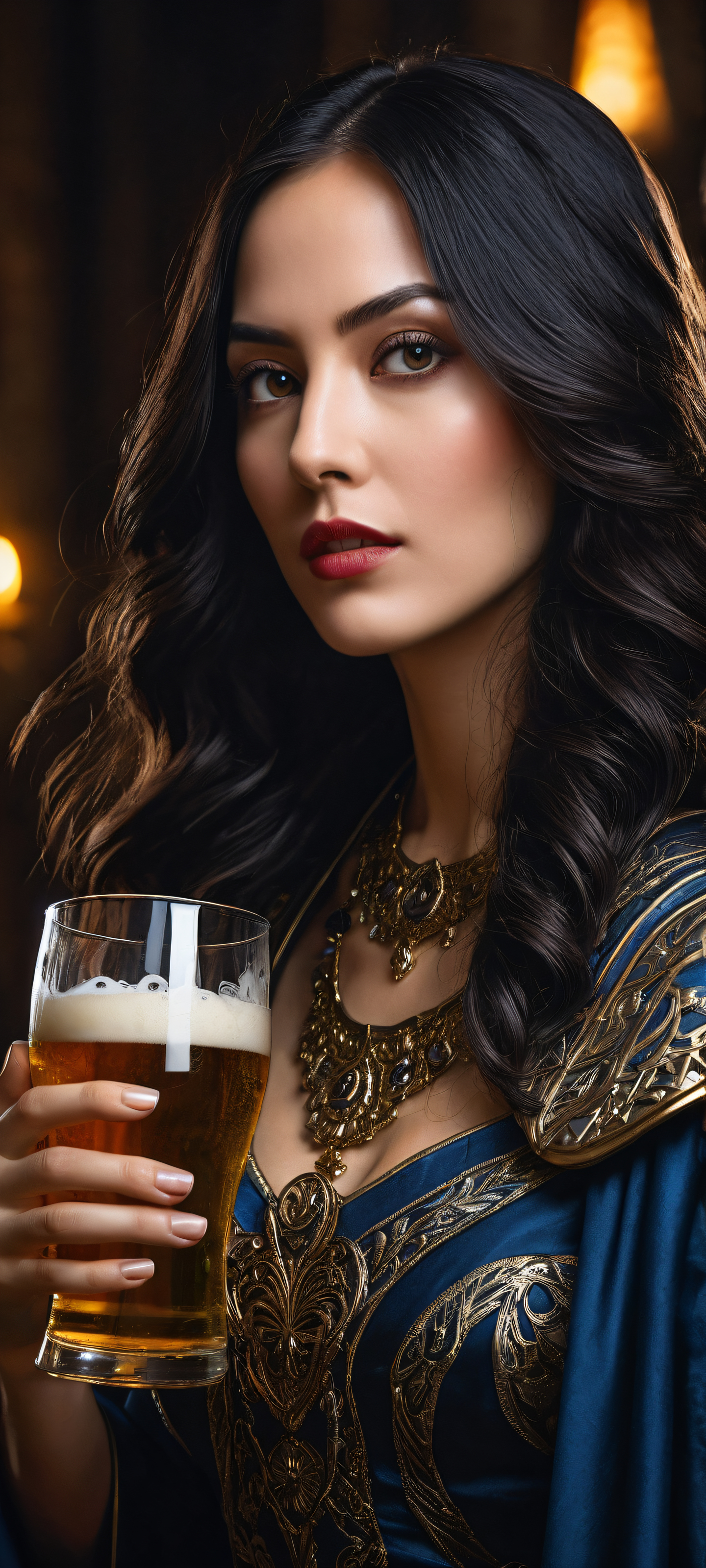 A breathtaking vertical portrait artwork of A maiden with dark hair, placing a glass of beer in her hand, offering a toast. Placed in the lower-middle, intricate micro-details reveal the intricacy of her fingers and the design of the Ghostblade sword., Perfectly clean and empty top half with vast pure void, allowing for a sharp focus on the subject. The bottom half is blurred to create an epic desktop wallpaper effect in a 16:9 aspect ratio., Award-winning digital art, 原始的な透明度, showcasing the mastery of fantasy art, Dark mode aesthetic with deep perfect blacks, striking crisp contrast, and elegant luminescent accents, Deep blues and purples dominate the palette, reflecting the mystique and mystery of fantasy art, elegant low-key lighting, deep perfect blacks, striking contrast, sleek dark mode aesthetic, luminescent accents, deep rich colors, portrait composition, centered subject in the lower middle, perfectly clean and smooth top half for UI, extreme depth of field blurred background, highly textured surfaces, intricate micro-details, physically based rendering, award-winning digital art, epic breathtaking scale, stunning visual impact, perfect composition, macOS wallpaper aesthetic, masterpiece, 2K QHD resolution, 9:20 aspect ratio.