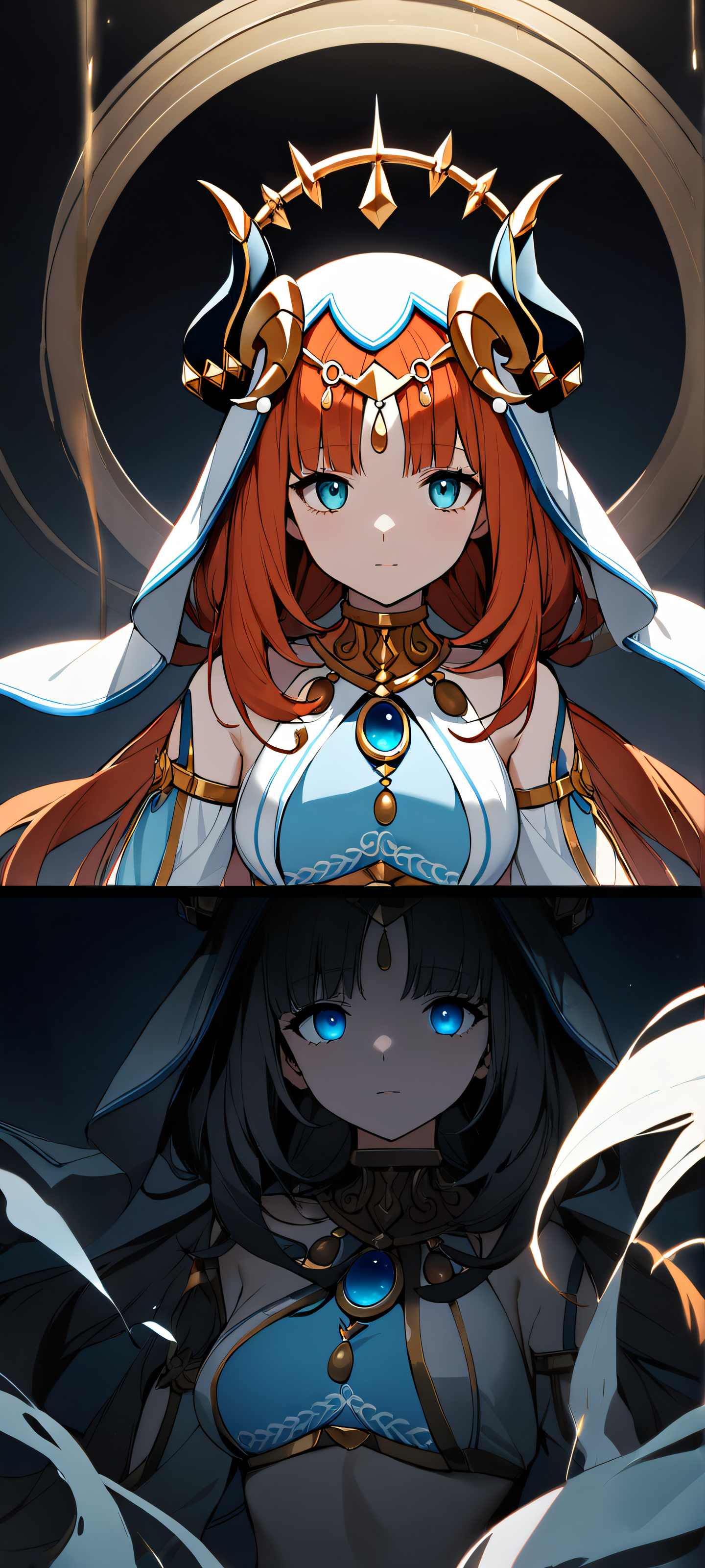 1girl, nilou, genshin impact, solo, masterpiece, best quality, very aesthetic, absurdres, highly detailed, looking at viewer, portrait composition, centered subject in the lower middle, perfectly clean and smooth top half for UI, Perfectly clean and empty top half with vast pure void, creating a seamless transition to the subject below., Predominant dark tones with hints of deep blues and subtle grays, evoking a sense of sophistication and mystery., elegant low-key lighting, striking contrast, deep perfect blacks, night scene, glowing lights, dramatic shadows