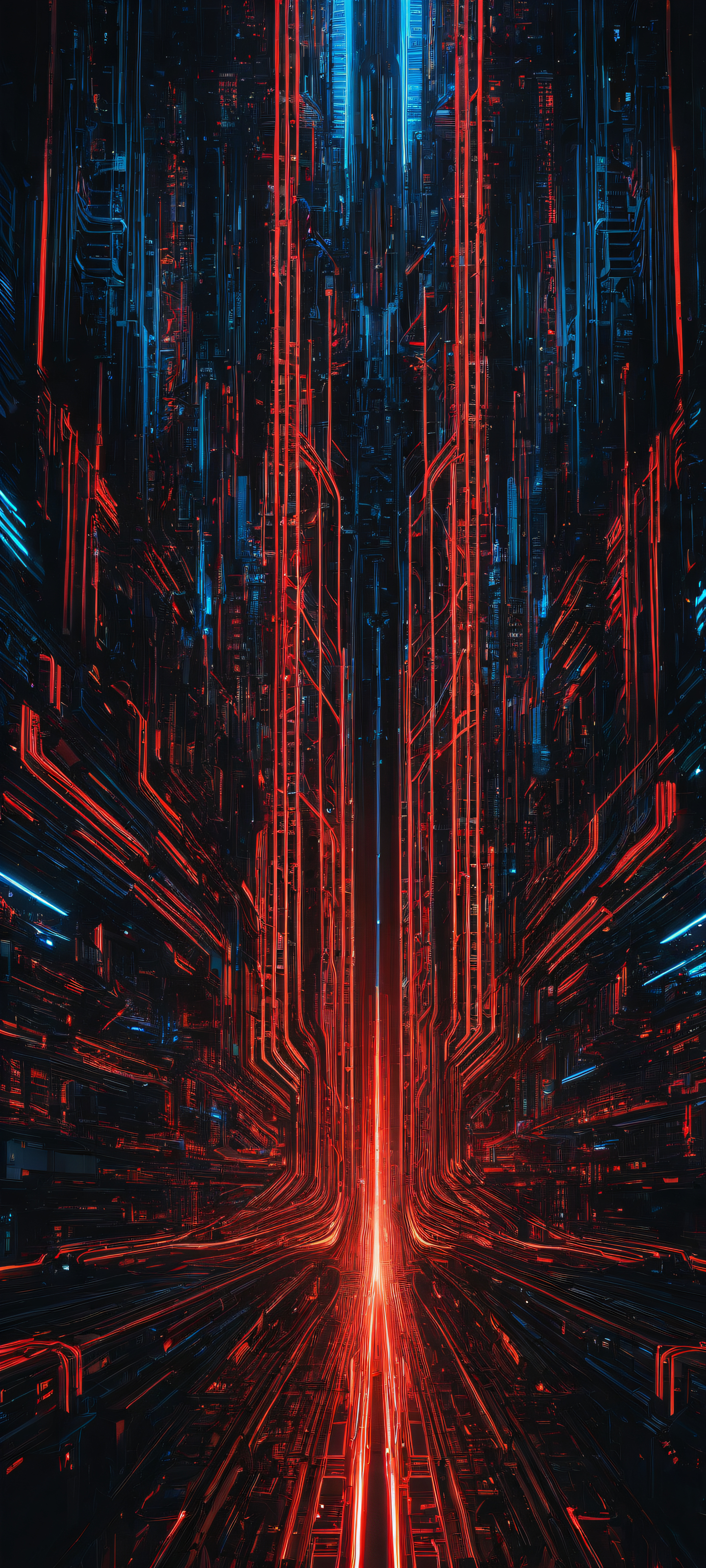 A breathtaking vertical portrait artwork of Neon Circuitry placed in the lower-middle with insane micro-details, Perfectly clean and empty top half with vast pure void, simple background, Award-winning digital art, stunning visual impact, 原始的な透明度, Deep perfect blacks with striking crisp contrast and elegant luminescent accents in a sleek dark mode aesthetic, Vibrant red and blue hues matching the requested mood of low light, elegant low-key lighting, deep perfect blacks, striking contrast, sleek dark mode aesthetic, luminescent accents, deep rich colors, portrait composition, centered subject in the lower middle, perfectly clean and smooth top half for UI, extreme depth of field blurred background, highly textured surfaces, intricate micro-details, physically based rendering, award-winning digital art, epic breathtaking scale, stunning visual impact, perfect composition, macOS wallpaper aesthetic, masterpiece, 2K QHD resolution, 9:20 aspect ratio.