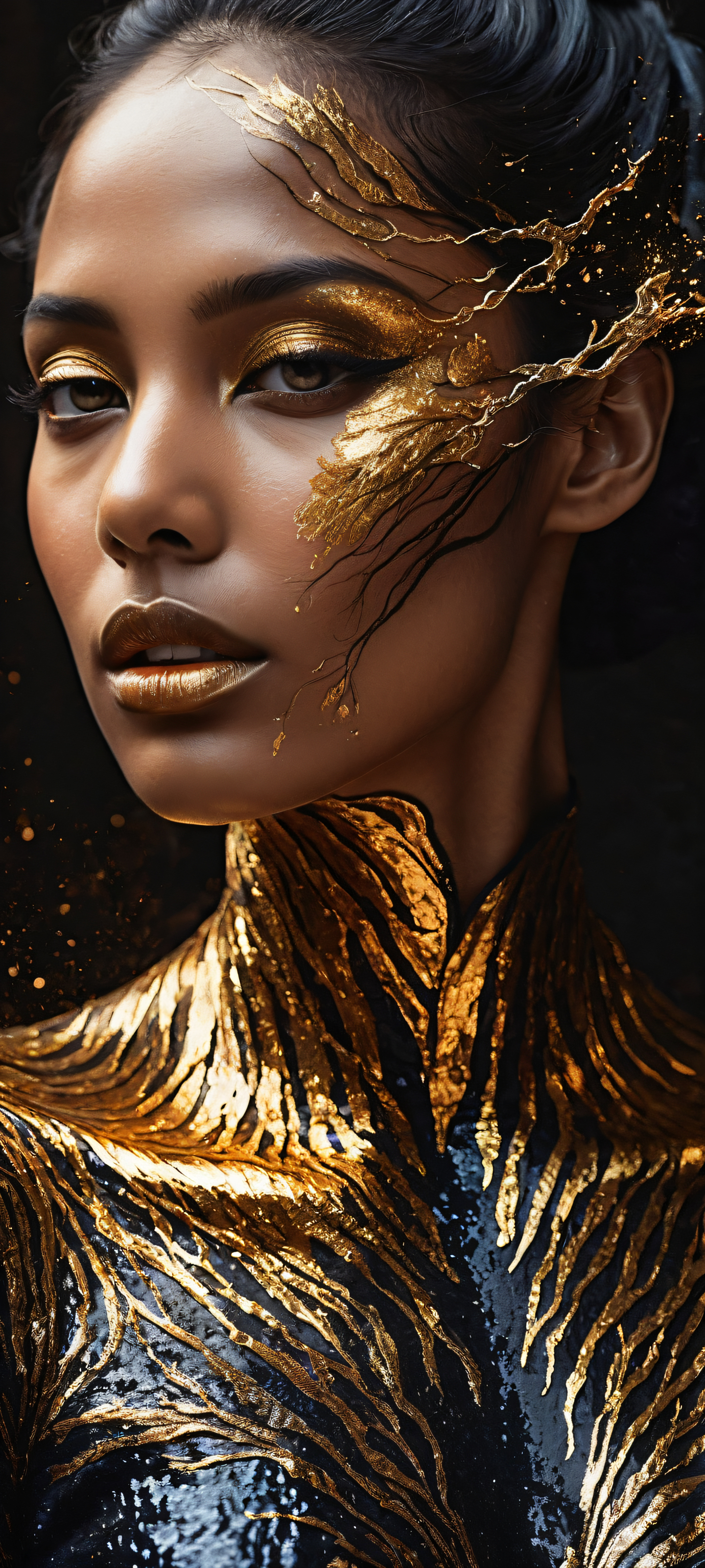 A breathtaking vertical portrait artwork of A woman with skin like polished obsidian, cracks of glowing molten gold spreading across her face like living veins, eyes reflecting distant galaxies, hair transforming into drifting black petals that dissolve into smoke; placed in the lower-middle, intricate micro-details., Perfectly clean and empty top half with vast pure void, gradually transitioning to a realm of surreal elegance and cinematic framing, Award-winning digital art, stunning visual impact, and pristine clarity, Ethereal lighting with soft rim lighting, deep shadows creating an otherworldly atmosphere, and ray-traced reflections that seem to transport the viewer into distant galaxies, [‘Dark obsidian’, ‘Golden molten hues’, ‘Deep blues and purples of distant galaxies’, ‘Rich blackness of hair transforming into drifting petals’], ethereal lighting, radiant, brilliant colors, ray traced reflections, 原始的な透明度, portrait composition, centered subject in the lower middle, perfectly clean and smooth top half for UI, extreme depth of field blurred background, highly textured surfaces, intricate micro-details, physically based rendering, award-winning digital art, epic breathtaking scale, stunning visual impact, perfect composition, macOS wallpaper aesthetic, masterpiece, 2K QHD resolution, 9:20 aspect ratio.