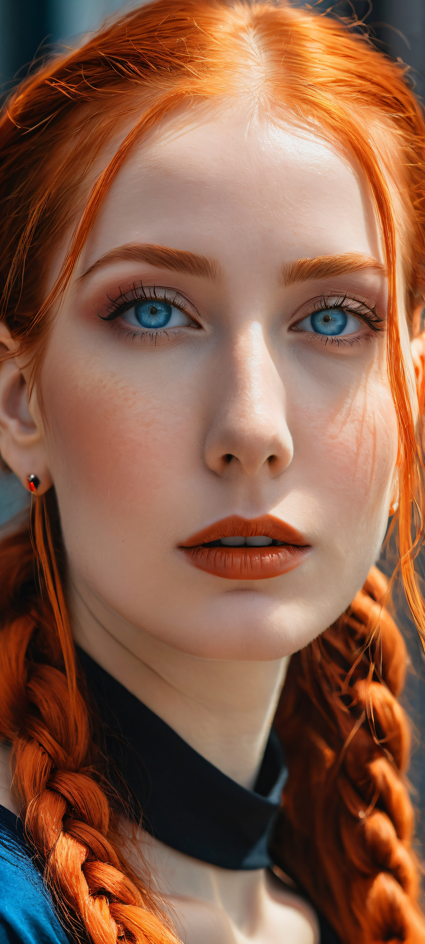 A breathtaking vertical portrait artwork of A stunning young woman with vibrant orange hair styled in long pigtails, placed in the lower-middle with insane micro-details of her facial features and outfit. Her piercing blue eyes are cast downwards, avoiding eye contact., A perfectly clean and empty top half with vast pure void above, allowing for unobstructed UI breathing space. The background is a dark, sleek gradient that transitions seamlessly into the subject., Award-winning digital art, 原始的な透明度, and a mastery of texture and scale that rivals Apple UI standards., Deep perfect blacks and striking crisp contrast create a sense of luxury and sophistication, while elegant luminescent accents subtly highlight the subject’s features without overpowering them., A palette dominated by rich oranges, blues, and deep reds, evoking a sense of passion and glamour., elegant low-key lighting, deep perfect blacks, striking contrast, sleek dark mode aesthetic, luminescent accents, deep rich colors, portrait composition, centered subject in the lower middle, perfectly clean and smooth top half for UI, extreme depth of field blurred background, highly textured surfaces, intricate micro-details, physically based rendering, award-winning digital art, epic breathtaking scale, stunning visual impact, perfect composition, macOS wallpaper aesthetic, masterpiece, 2K QHD resolution, 9:20 aspect ratio.