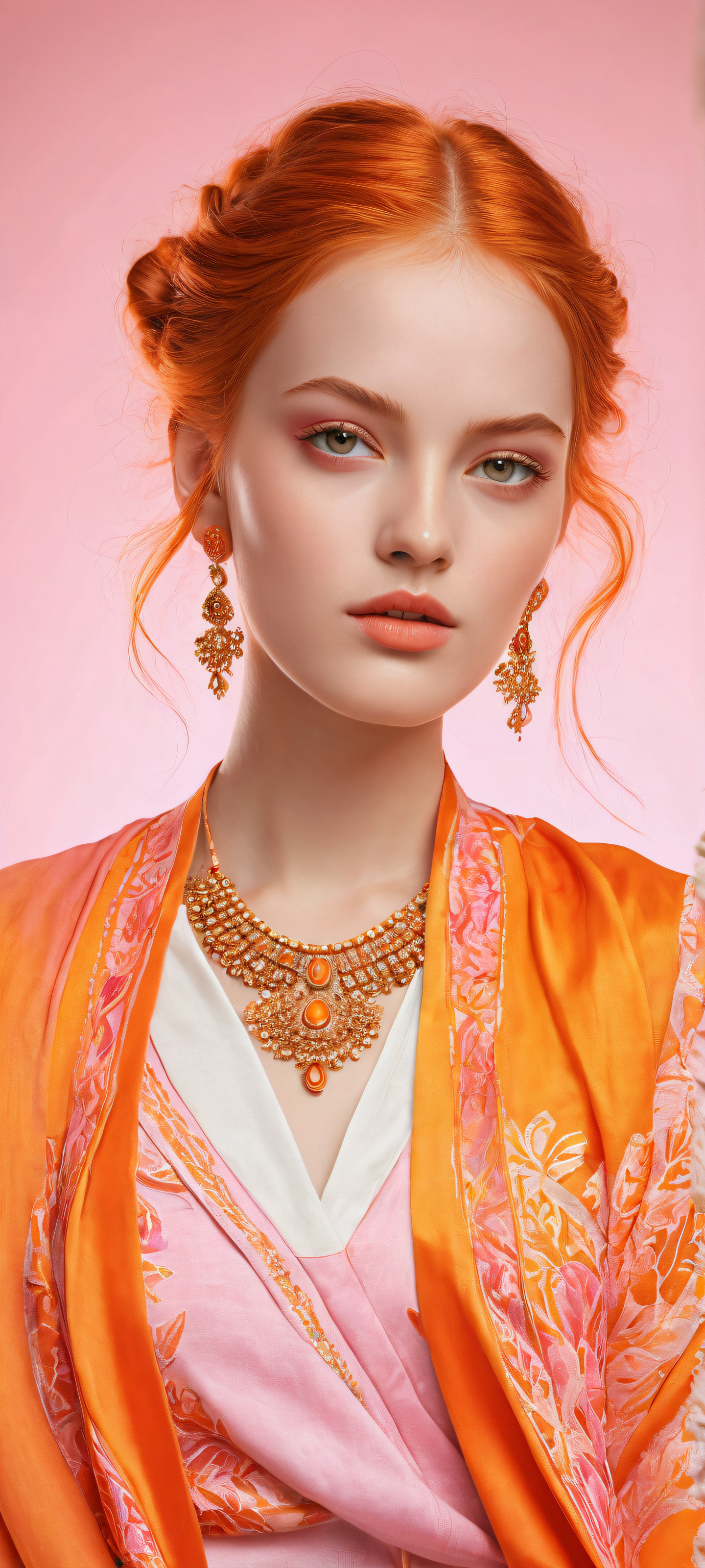 A breathtaking vertical portrait artwork of A stylized depiction of a young girl with bright orange hair, placed in the lower-middle with insane micro-details. Her piercing brown eyes are framed by a pink shirt and an vibrant orange-yellow skirt with a wb-print pattern., Perfectly clean and empty top half with vast pure void, allowing for seamless scrolling and UI breathing space, Award-winning digital art, 原始的な透明度, showcasing the beauty of minimalistic design, Ethereal softbox lighting, creating a radiant glow that accentuates her features and highlights the vibrant colors of her attire, #FFC080 (Warm Orange), #F8E231 (Soft Pink), #F2BCE1 (Creamy White), ethereal lighting, radiant, brilliant colors, ray traced reflections, 原始的な透明度, portrait composition, centered subject in the lower middle, perfectly clean and smooth top half for UI, extreme depth of field blurred background, highly textured surfaces, intricate micro-details, physically based rendering, award-winning digital art, epic breathtaking scale, stunning visual impact, perfect composition, macOS wallpaper aesthetic, masterpiece, 2K QHD resolution, 9:20 aspect ratio.