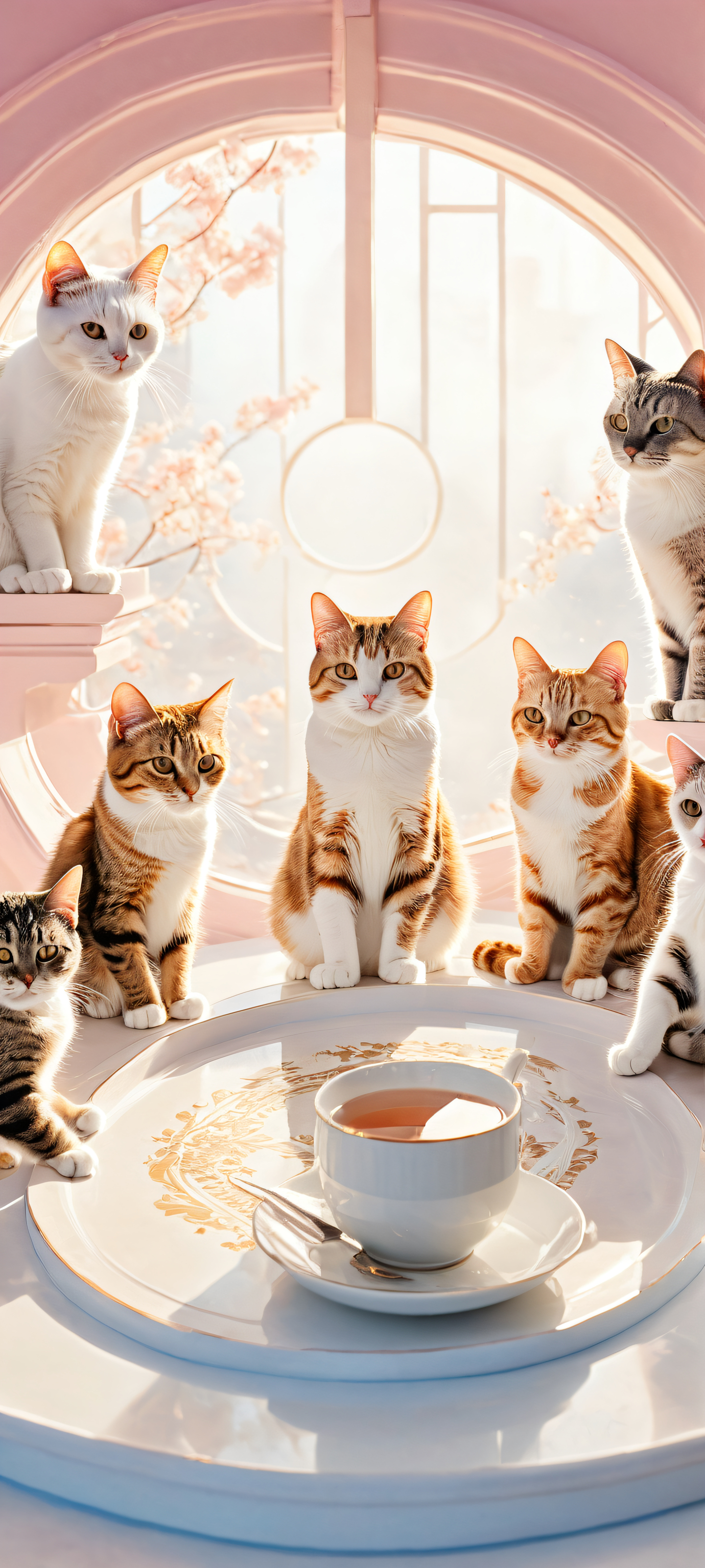 A breathtaking vertical portrait artwork of Seven cats sitting in a circle, placed in the lower-middle with insane micro-details, such as intricate whiskers and adorable expressions. The felines are surrounded by an eerie atmosphere., The background features a 2-meter tall cat, Yukichi, making tea in a perfectly clean and empty top half with vast pure void, Award-winning digital art, stunning visual impact, with pristine clarity. Think Apple UI level design, Ethereal lighting with radiant, brilliant colors, ray-traced reflections, and pristine clarity. The scene is bathed in an otherworldly glow, Pastel hues of pink, blue, and yellow, evoking a sense of whimsy and playfulness, with the dominant color being a soft, creamy white, ethereal lighting, radiant, brilliant colors, ray traced reflections, 原始的な透明度, portrait composition, centered subject in the lower middle, perfectly clean and smooth top half for UI, extreme depth of field blurred background, highly textured surfaces, intricate micro-details, physically based rendering, award-winning digital art, epic breathtaking scale, stunning visual impact, perfect composition, macOS wallpaper aesthetic, masterpiece, 2K QHD resolution, 9:20 aspect ratio.