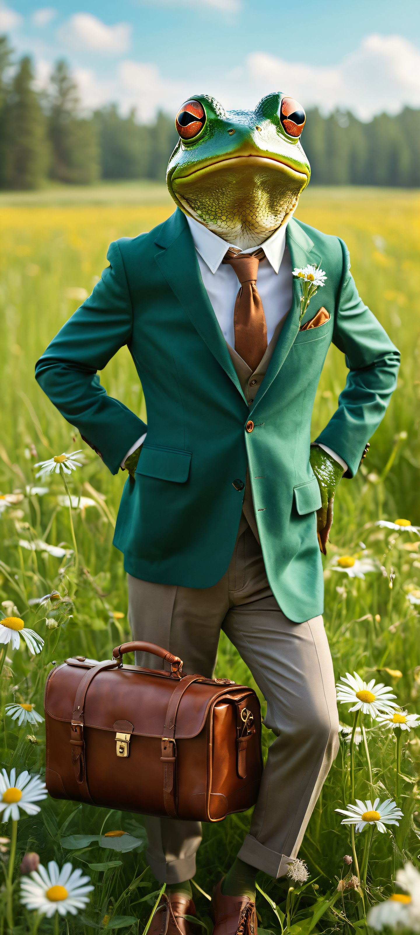 A breathtaking vertical portrait artwork of A whimsical frog in a tailored suit riding a huge mouse with a leather saddle, placed in the lower-middle with insane micro-details., Perfectly clean and empty top half with vast pure void, meadow background with soft wildflowers and green grass, Award-winning digital art, stunning visual impact, and pristine clarity., Ethereal lighting with gentle daylight, radiant brilliant colors, ray-traced reflections, and pristine clarity. Bright and airy., Dominant color palette of earthy tones: greens, browns, and blues, evoking a playful storybook mood., ethereal lighting, radiant, brilliant colors, ray traced reflections, 原始的な透明度, portrait composition, centered subject in the lower middle, perfectly clean and smooth top half for UI, extreme depth of field blurred background, highly textured surfaces, intricate micro-details, physically based rendering, award-winning digital art, epic breathtaking scale, stunning visual impact, perfect composition, macOS wallpaper aesthetic, masterpiece, 2K QHD resolution, 9:20 aspect ratio.