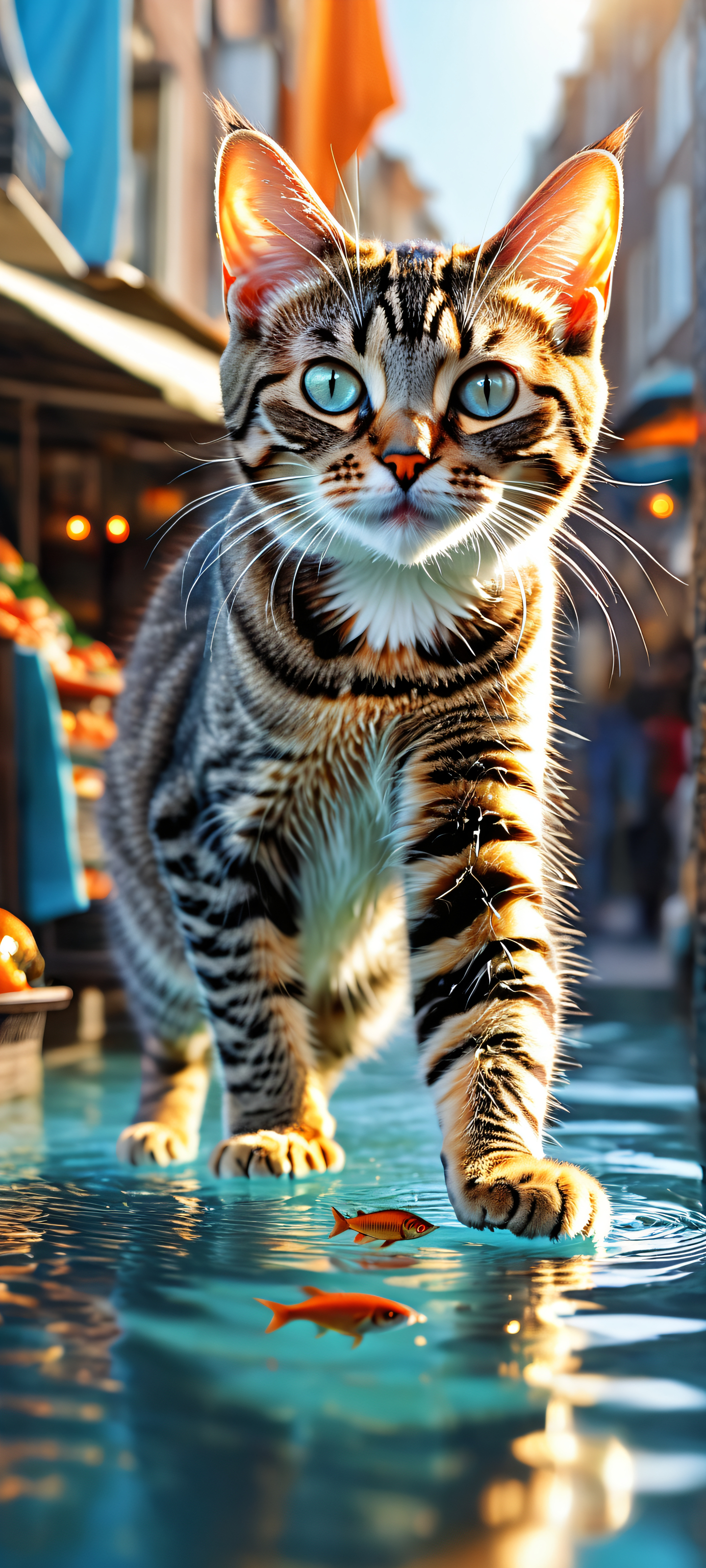 Get ready to be mesmerized by this breathtaking digital art! iPhone用に完全に最適化, サムスンギャラクシー, と Android のホーム画面, this stunning portrait composition features a small young tabby cat tightly hugging a large silver fish while running on two legs. The top half is immaculately clean, giving way to a vibrant Dutch street market below, complete with fresh catches and ray-traced reflections that will leave you in awe.