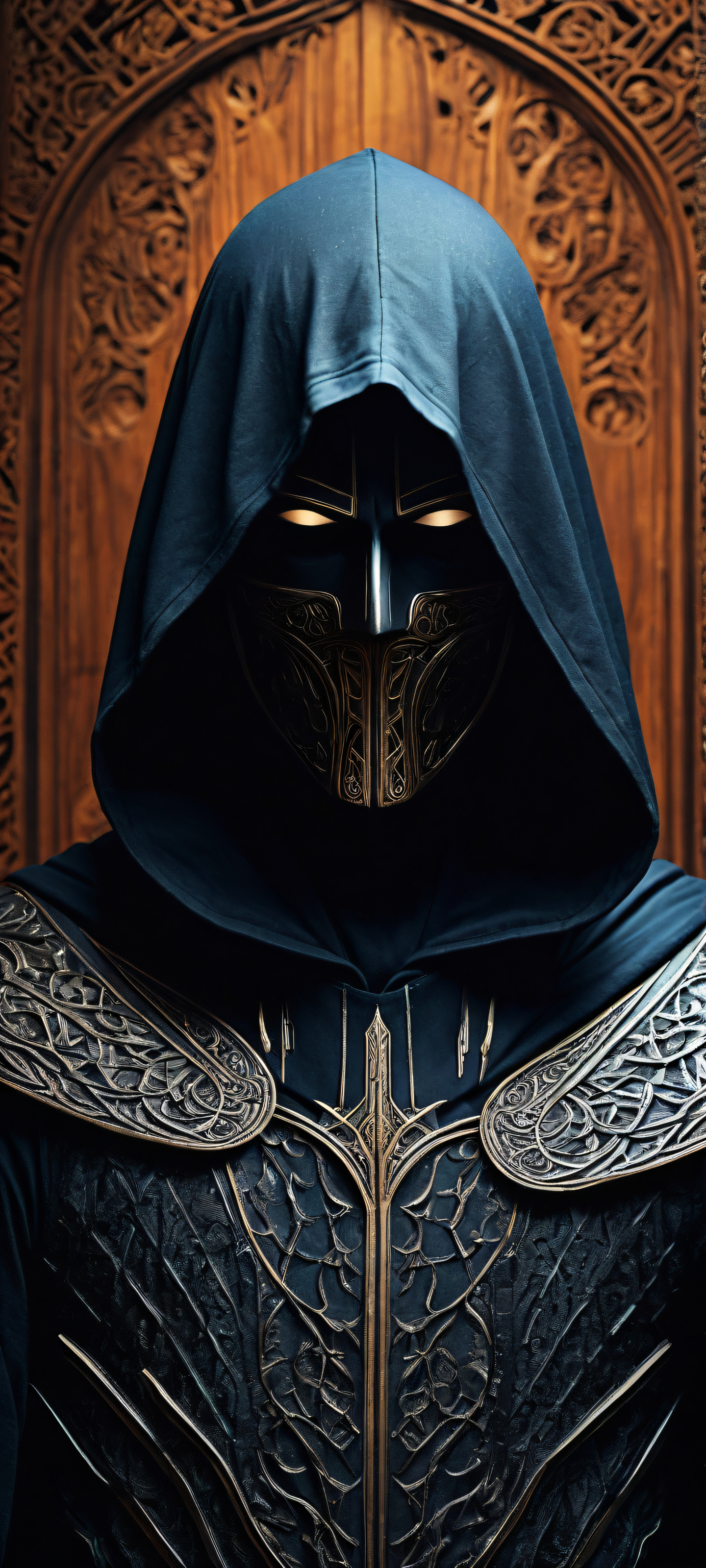 A breathtaking vertical portrait artwork of A lone male figure, hooded and cloaked, with closed eyes and mouth, placed in the lower-middle of the wallpaper, showcasing insane micro-details in his wood-carved armor, Perfectly clean and empty top half with a vast pure void, gradually transitioning to a serene wooden background in the lower half, Award-winning digital art, 原始的な透明度, and stunning visual impact, perfectly blending anime elements with iOS-inspired design, Sleek Dark Mode aesthetic, featuring deep perfect blacks, striking crisp contrast, and elegant luminescent accents, Dominant blue hues, complemented by warm wood tones and subtle highlights, evoking a sense of mystique and wonder, elegant low-key lighting, deep perfect blacks, striking contrast, sleek dark mode aesthetic, luminescent accents, deep rich colors, portrait composition, centered subject in the lower middle, perfectly clean and smooth top half for UI, extreme depth of field blurred background, highly textured surfaces, intricate micro-details, physically based rendering, award-winning digital art, epic breathtaking scale, stunning visual impact, perfect composition, macOS wallpaper aesthetic, masterpiece, 2K QHD resolution, 9:20 aspect ratio.