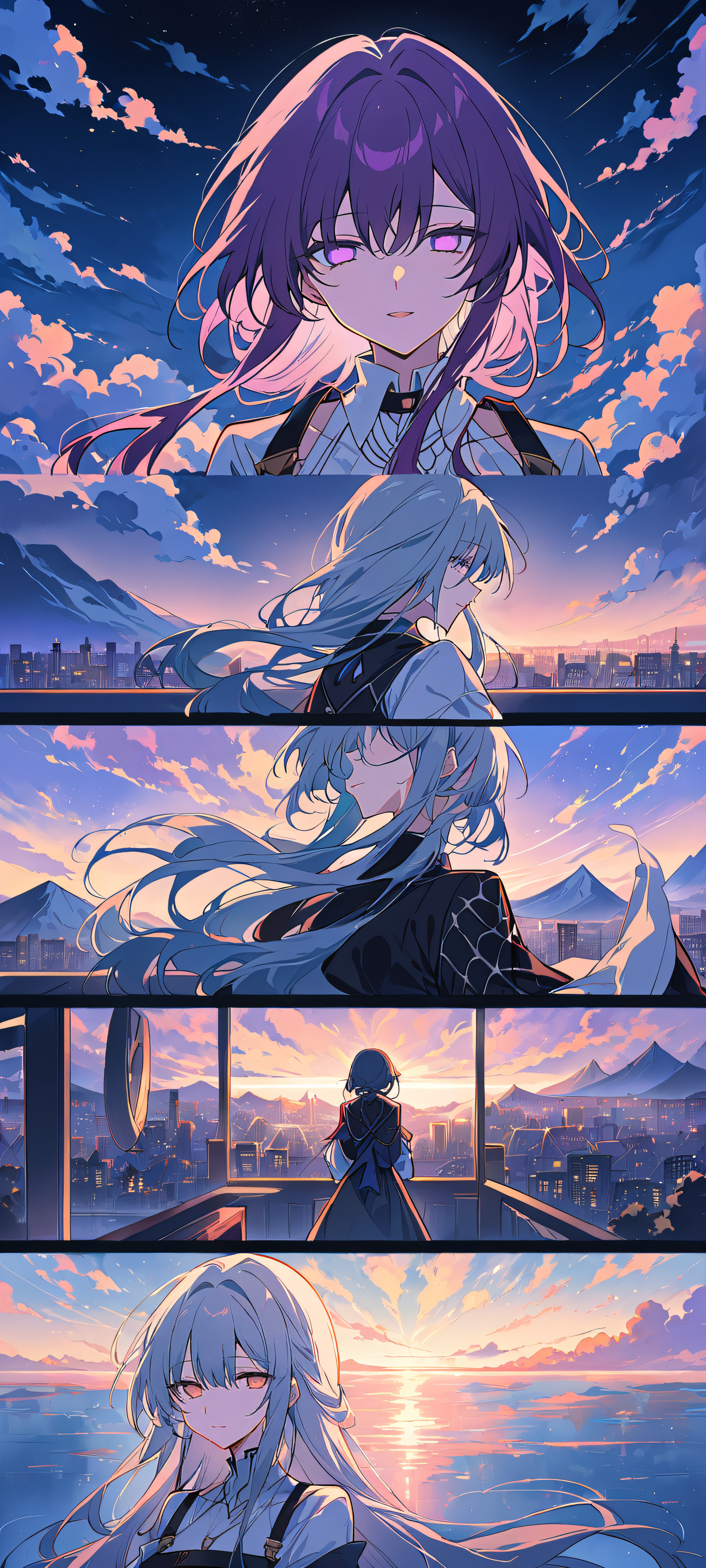 score_9, score_8_up, score_7_up, source_anime, portrait composition, centered subject in the lower middle, perfectly clean and smooth top half for UI, kafka from honkai: star rail, Perfectly clean and empty top half with vast pure void of winter evening sky above a cityscape with mountains and clouds in the distance, perfectly capturing the tranquility of the scene, Dominant palette of soft pastel hues with touches of deep blues and purples, evoking a sense of serene elegance and wonder, stunning anime illustration, masterpiece, best quality, highly detailed, 2K QHD resolution, 9:20 aspect ratio, bright and airy, ethereal lighting, beautiful sky, colorful, vivid