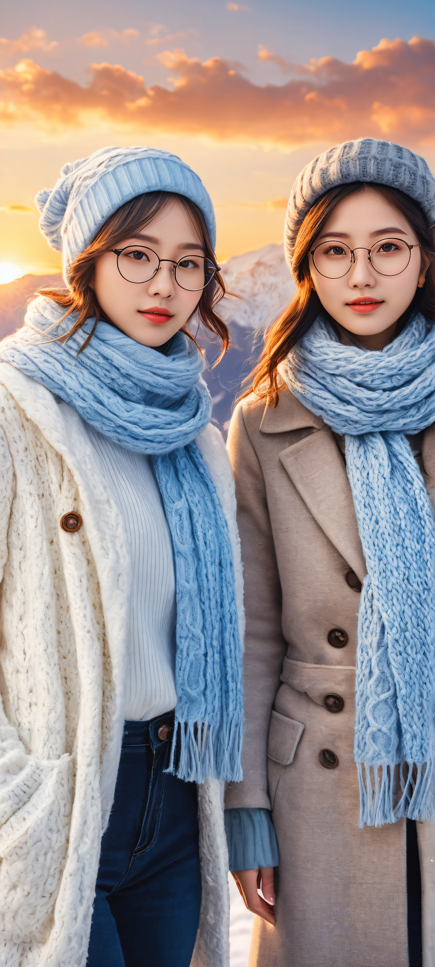 A breathtaking vertical portrait artwork of Two anime girls placed in the lower-middle, intricate micro-details of their winter outfits, complete with glasses and scarves., A perfectly clean and empty top half with vast pure void, giving way to a breathtaking sunset landscape with city lights twinkling on the horizon, surrounded by majestic mountains and fluffy clouds., Award-winning digital art, stunning visual impact, and pristine clarity in a 16:9 aspect ratio., Ethereal lighting with radiant, brilliant colors, ray-traced reflections, and pristine clarity, as if painted by the warm glow of the setting sun., Dominant palette: Soft blues (#4567b7), creamy whites (#f5f5dc), and gentle oranges (#ffd700) evoking a sense of cozy winter wonder., ethereal lighting, radiant, brilliant colors, ray traced reflections, 原始的な透明度, portrait composition, centered subject in the lower middle, perfectly clean and smooth top half for UI, extreme depth of field blurred background, highly textured surfaces, intricate micro-details, physically based rendering, award-winning digital art, epic breathtaking scale, stunning visual impact, perfect composition, macOS wallpaper aesthetic, masterpiece, 2K QHD resolution, 9:20 aspect ratio.