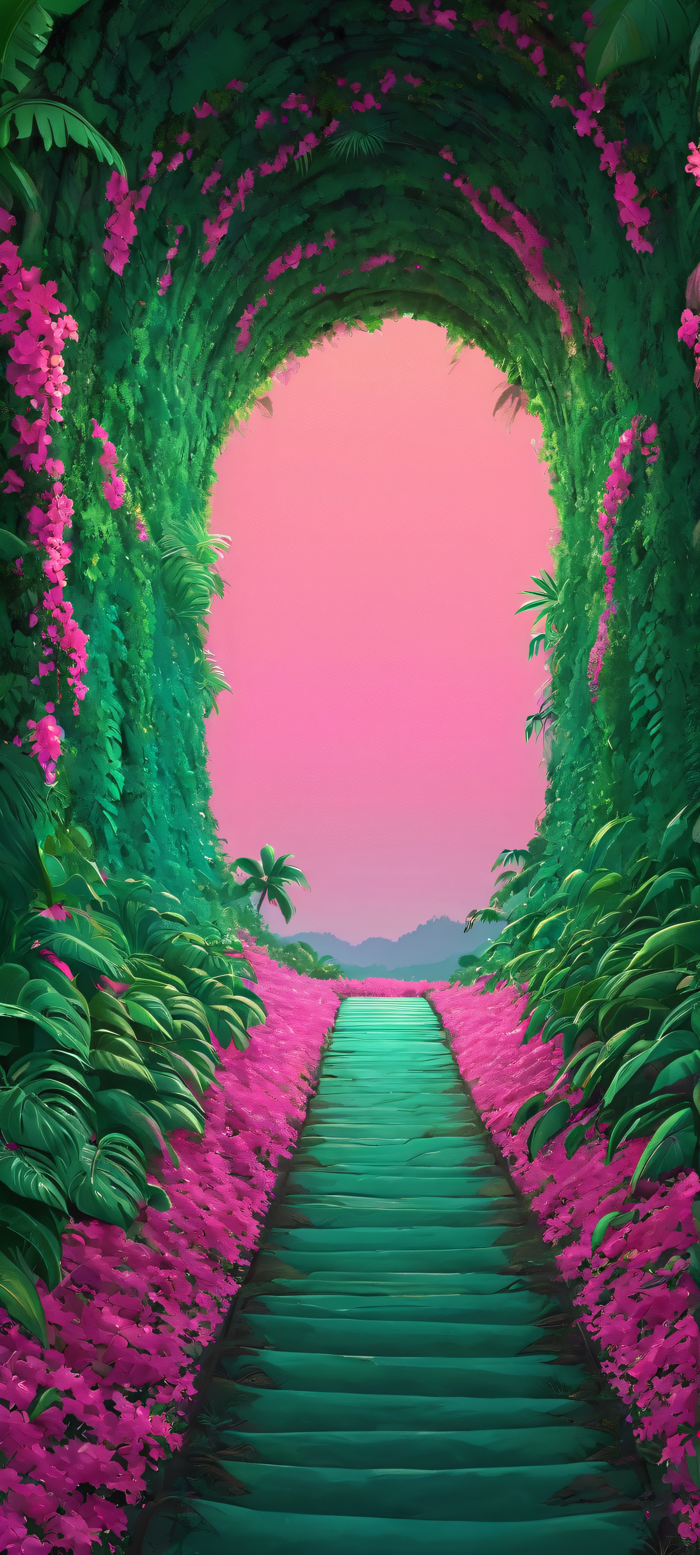 Transport yourself to a mystical jungle world with this stunning 2K QHD masterpiece, perfectly optimized for your iPhone, Samsung Galaxy, or Android home screen. The vibrant hues of green, pink, and turquoise blend together in harmony, creating an immersive experience like no other.