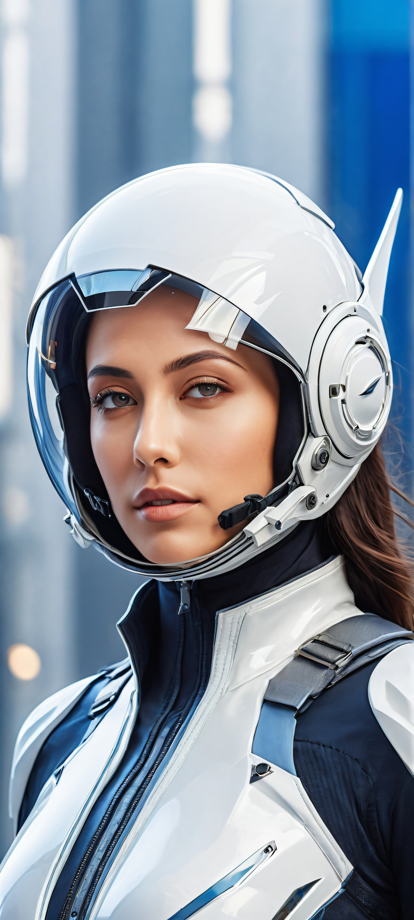 A breathtaking vertical portrait artwork of Krystal, a skilled pilot placed in the lower-middle with insane micro-details of her Arwing’s intricate controls and futuristic interfaces., A vast pure void with perfectly clean and empty top half, leaving ample space for UI widgets to breathe. A subtle gradient of deep blues evokes the sense of space travel., Award-winning digital art, stunning visual impact, with a focus on crisp lines and textures reminiscent of high-end Apple UI design., Ethereal lighting with radiant, brilliant colors that evoke a sense of wonder and excitement. Ray-traced reflections off Krystal’s suit and the Arwing’s hull create a sense of depth and dimensionality., A dominant palette of deep blues (#032B44) and bright whites (#FFFFFF), accented by touches of metallic silver (#B1B1B1) and subtle gradient transitions., ethereal lighting, radiant, brilliant colors, ray traced reflections, pristine clarity, portrait composition, centered subject in the lower middle, perfectly clean and smooth top half for UI, extreme depth of field blurred background, highly textured surfaces, intricate micro-details, physically based rendering, award-winning digital art, epic breathtaking scale, stunning visual impact, perfect composition, macOS wallpaper aesthetic, masterpiece, 2K QHD resolution, 9:20 aspect ratio.
