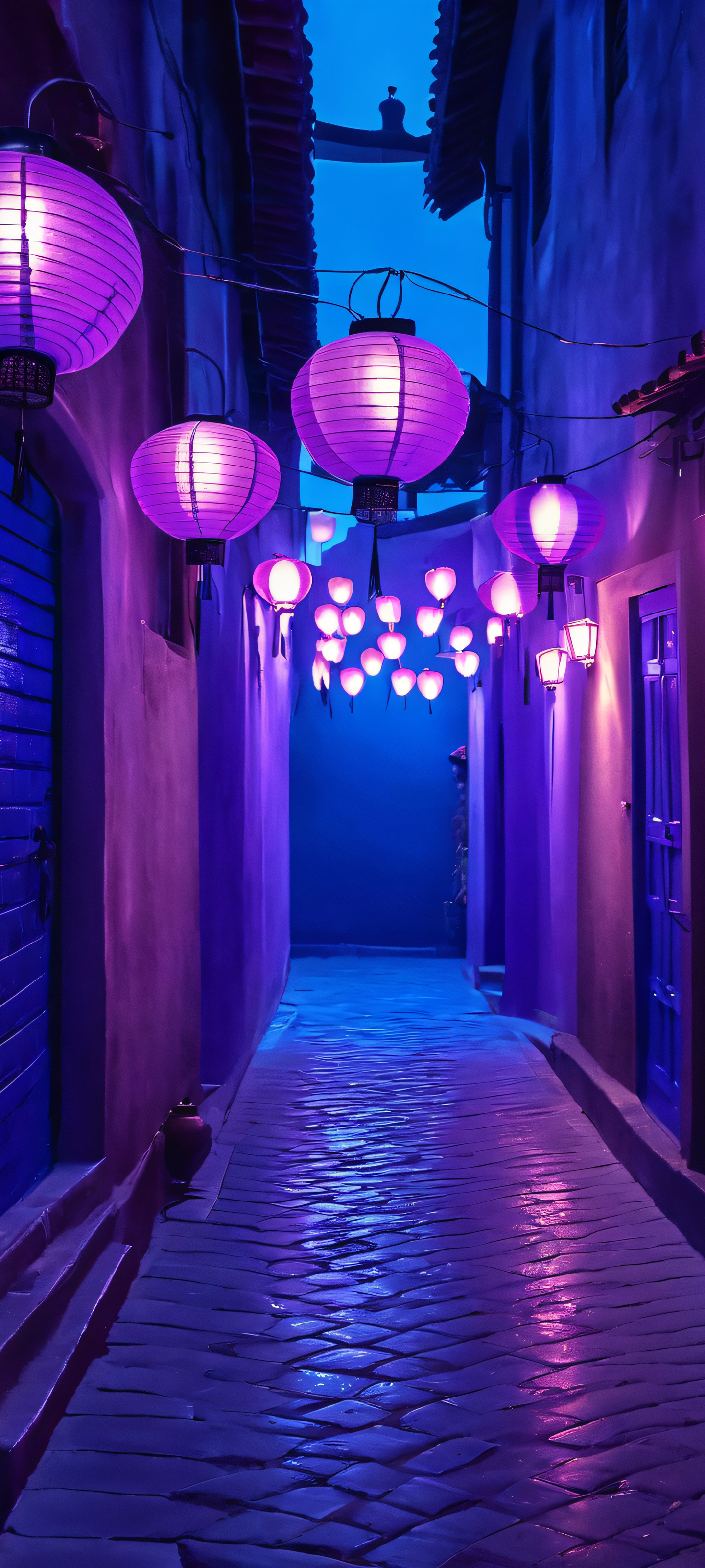 A serene alleyway scene with lanterns illuminated by moody overhead lighting, perfect for iPhone/Android home screens.