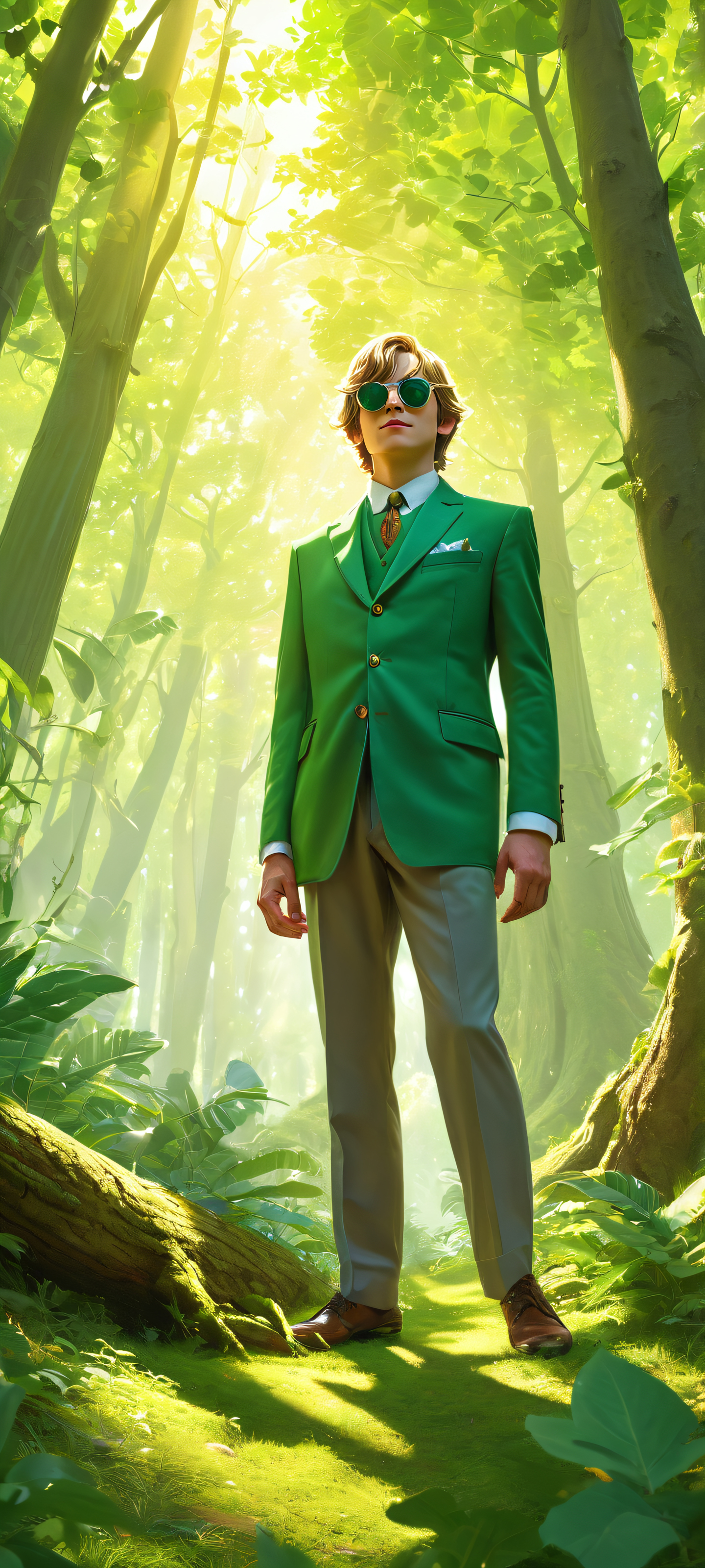 A breathtaking vertical portrait artwork of Link placed in the lower-middle, wearing sunglasses and pinstripe suit, surrounded by Skull Kids peeking from behind trees, with intricate micro-details on Link’s outfit and accessories, Perfectly clean and empty top half with vast pure void, while the lower half is set in the Lost Woods, with Shafts of mysterious green light casting dramatic shadows over this surreal transaction scene, Award-winning digital art, pristine clarity, showcasing a perfect balance of whimsical humor and magical wonder, Ethereal lighting with radiant, brilliant green hues, ray traced reflections, and pristine clarity, capturing the whimsical and magical essence of the scene, Dominant palette of calming greens, creamy whites, and subtle earthy tones, evoking a sense of wonder, curiosity, and playful mischief, ethereal lighting, radiant, brilliant colors, ray traced reflections, pristine clarity, portrait composition, centered subject in the lower middle, perfectly clean and smooth top half for UI, extreme depth of field blurred background, highly textured surfaces, intricate micro-details, physically based rendering, award-winning digital art, epic breathtaking scale, stunning visual impact, perfect composition, macOS wallpaper aesthetic, masterpiece, 2K QHD resolution, 9:20 aspect ratio.