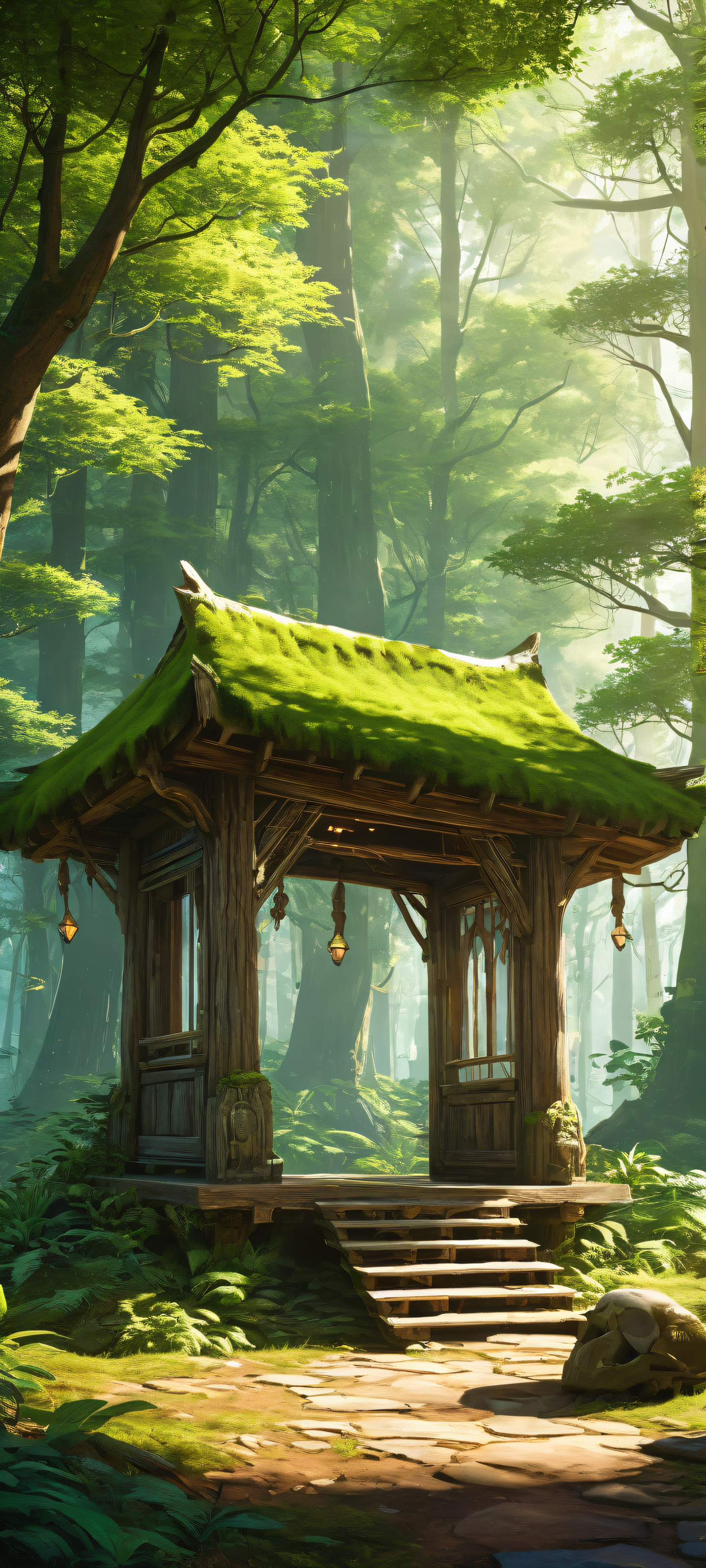 A breathtaking vertical portrait artwork of Link stands at a sketchy-looking wooden kiosk in the Lost Woods, placed in the lower-middle with insane micro-details of Skull Kids peeking from behind trees, snickering., Perfectly clean and empty top half with vast pure void allowing for seamless UI placement, beneath which lies a mystical forest scene with towering trees, foliage, and mysterious green light shafts., Award-winning digital art, stunning visual impact with pristine clarity and textured wood grain details., Ethereal, radiant lighting with brilliant green hues casting dramatic shadows and reflections on the wooden kiosk, Link’s suit, and surrounding environment., [‘Mossy Green’, ‘Deep Forest Brown’, ‘Creamy White’], ethereal lighting, radiant, brilliant colors, ray traced reflections, pristine clarity, portrait composition, centered subject in the lower middle, perfectly clean and smooth top half for UI, extreme depth of field blurred background, highly textured surfaces, intricate micro-details, physically based rendering, award-winning digital art, epic breathtaking scale, stunning visual impact, perfect composition, macOS wallpaper aesthetic, masterpiece, 2K QHD resolution, 9:20 aspect ratio.