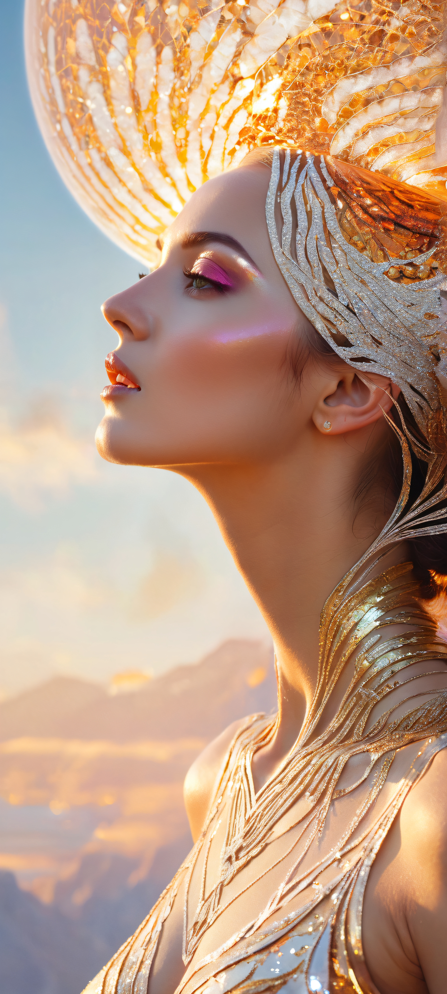This stunning artwork is perfectly optimized for your iPhone, Samsung Galaxy, or Android home screen. The prestigious woman takes center stage amidst an atmospheric background of subtle hints of illumination, with vibrant whites and rich gold tones dominating the palette.