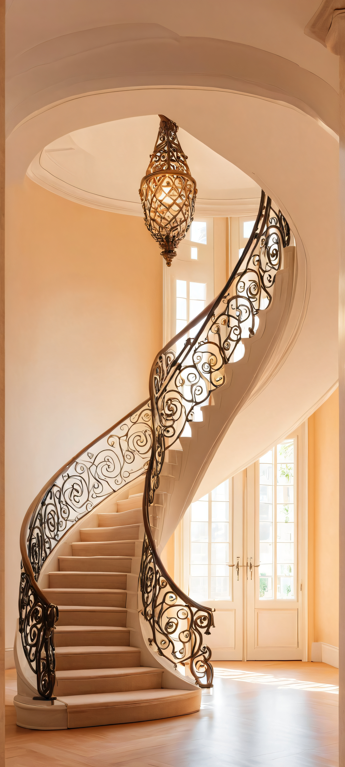 A stunning vertical wallpaper of a grand mansion's spiral staircase, perfectly optimized for iPhone and Android devices. This masterpiece features soft natural light and luxurious details.
