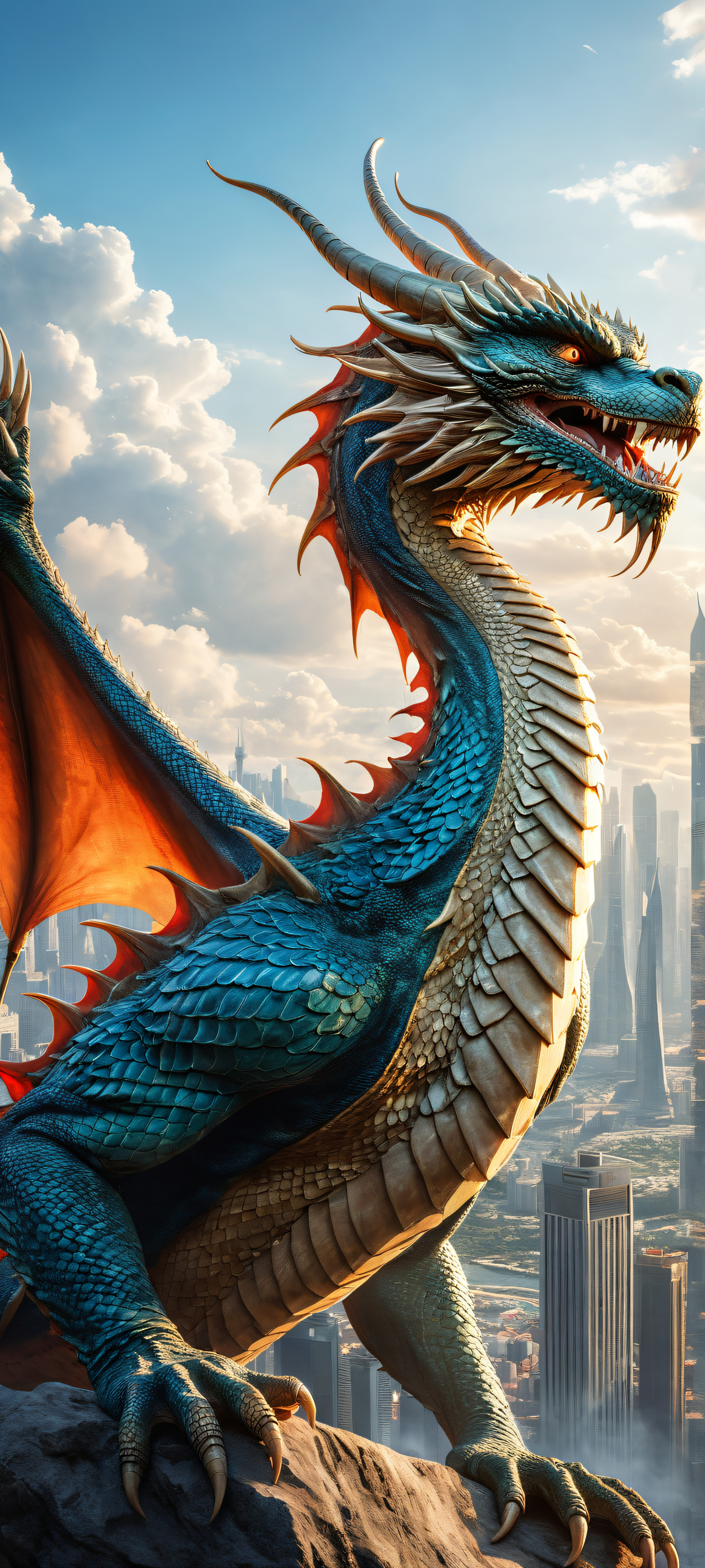 A breathtaking vertical portrait artwork of A majestic Chinese dragon placed in the lower-middle, intricate micro-details reveal its scaly texture and fiery breath., The cityscape in the background is perfectly clean and empty top half with vast pure void, allowing the dragon to take center stage., Award-winning digital art, pristine clarity, and stunning visual impact. Inspired by the latest 8K resolution, this masterpiece is a perfect fit for your 16:9 aspect ratio screen., Ethereal lighting illuminates the scene with radiant, brilliant colors. Ray-traced reflections add depth and dimensionality to the artwork, creating a sense of grandeur and drama., Dominant colors include fiery oranges, yellows, and reds, evoking the dragon’s intense passion and energy. Soft blues and whites in the background cityscape provide a subtle contrast and balance out the boldness., ethereal lighting, radiant, brilliant colors, ray traced reflections, pristine clarity, portrait composition, centered subject in the lower middle, perfectly clean and smooth top half for UI, extreme depth of field blurred background, highly textured surfaces, intricate micro-details, physically based rendering, award-winning digital art, epic breathtaking scale, stunning visual impact, perfect composition, macOS wallpaper aesthetic, masterpiece, 2K QHD resolution, 9:20 aspect ratio.