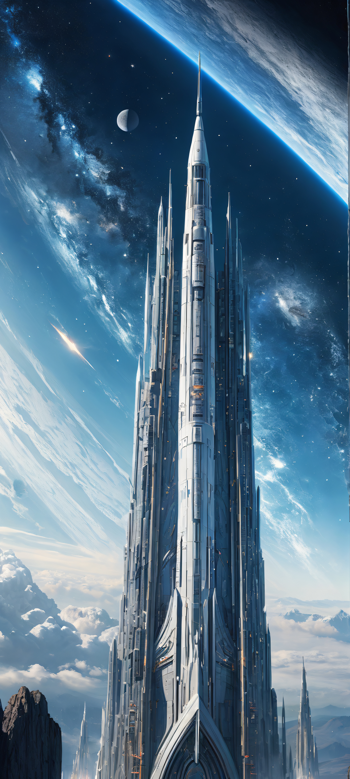 A majestic spaceship on a celestial background with intricate details and stunning metallic textures, perfectly optimized for iPhone/Android home screens.