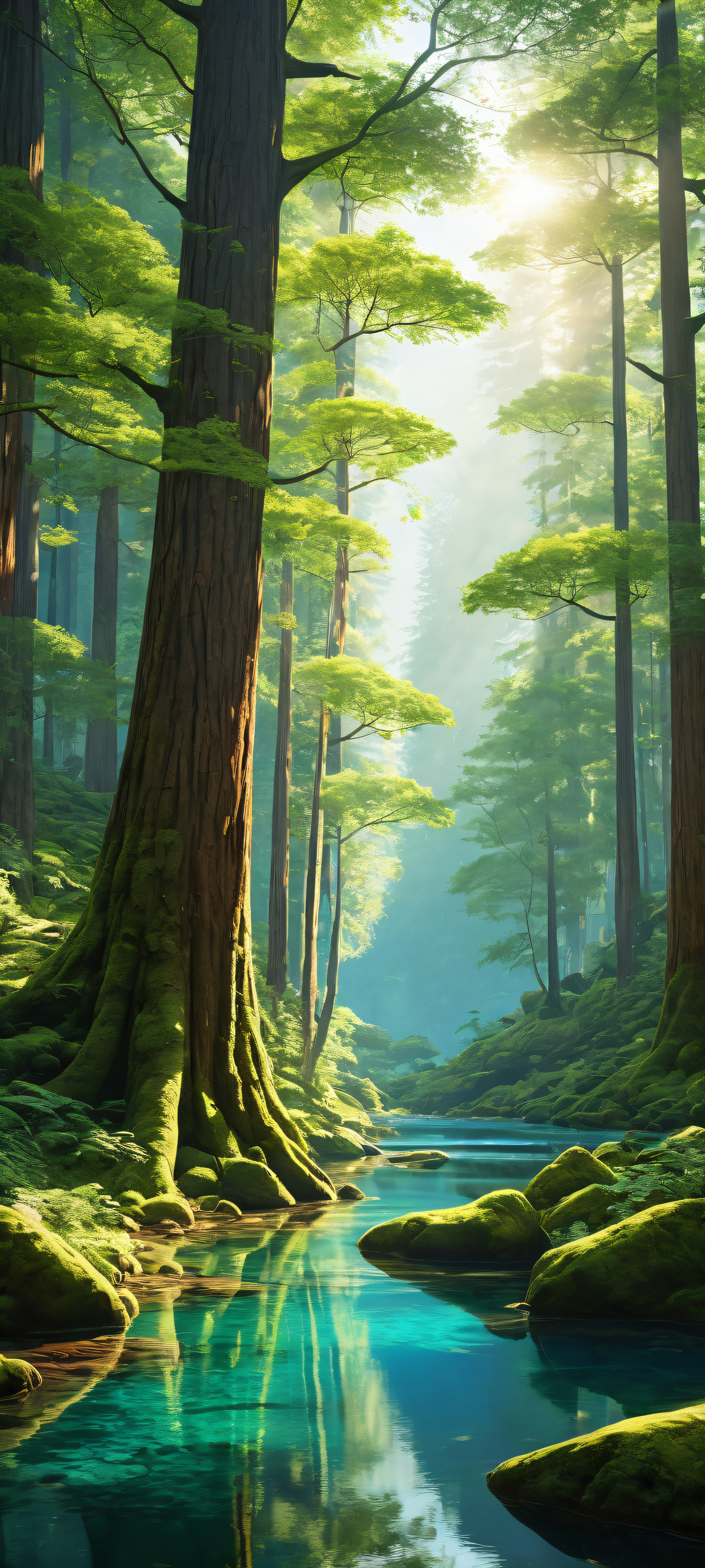 A breathtaking vertical portrait artwork of Majestic Trees placed in the lower-middle with insane micro-details, A perfectly clean and empty top half with vast pure void, gradually transitioning to a dense forest with towering trees, rocks, and water features, Award-winning digital art, pristine clarity, and stunning visual impact, Ethereal lighting with radiant, brilliant colors, ray-traced reflections, and crisp, sharp shadows, [‘Mossy Green’, ‘Earthly Brown’, ‘Cerulean Blue’], ethereal lighting, radiant, brilliant colors, ray traced reflections, pristine clarity, portrait composition, centered subject in the lower middle, perfectly clean and smooth top half for UI, extreme depth of field blurred background, highly textured surfaces, intricate micro-details, physically based rendering, award-winning digital art, epic breathtaking scale, stunning visual impact, perfect composition, macOS wallpaper aesthetic, masterpiece, 2K QHD resolution, 9:20 aspect ratio.