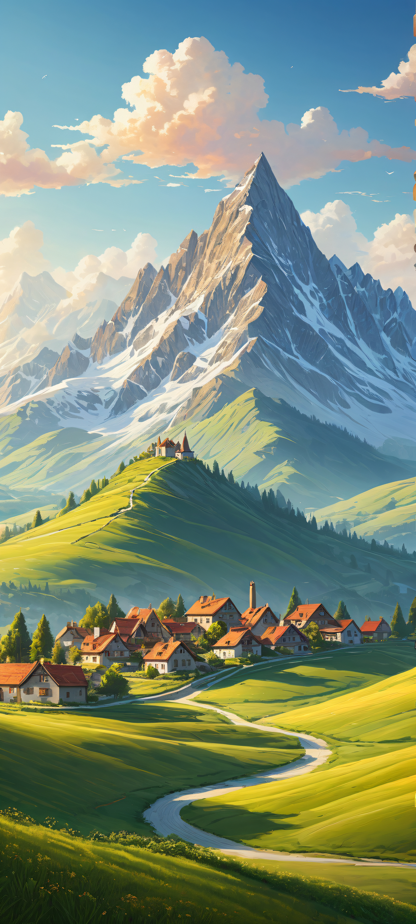 This stunning digital art features a majestic mountain range in the lower-middle with intricate micro-details. Perfectly clean and empty top half provides a serene landscape with rolling hills, a distant house, and radiant colors. Pristine clarity and stunning visual impact make it perfect for your iPhone or Samsung Galaxy home screen.