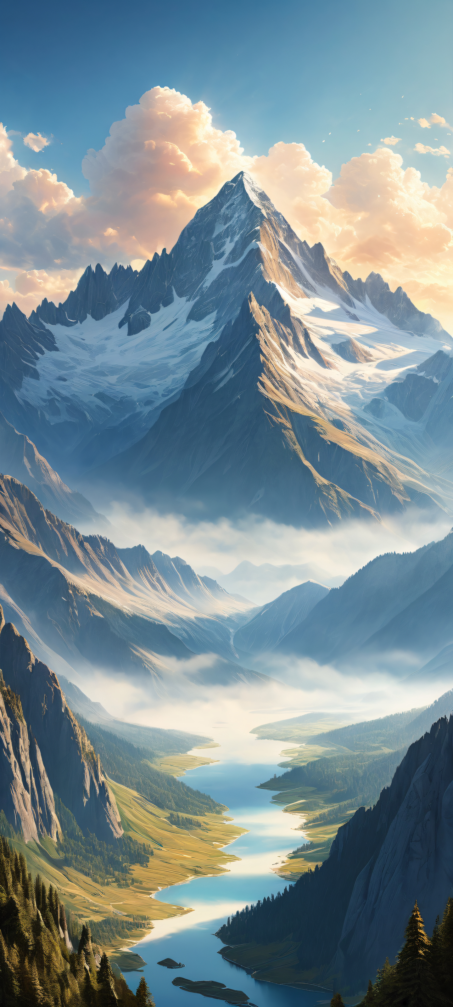 iPhone and Android users will love this breathtaking vertical portrait artwork featuring a majestic mountain range with intricate micro-details of clouds and sunlight.