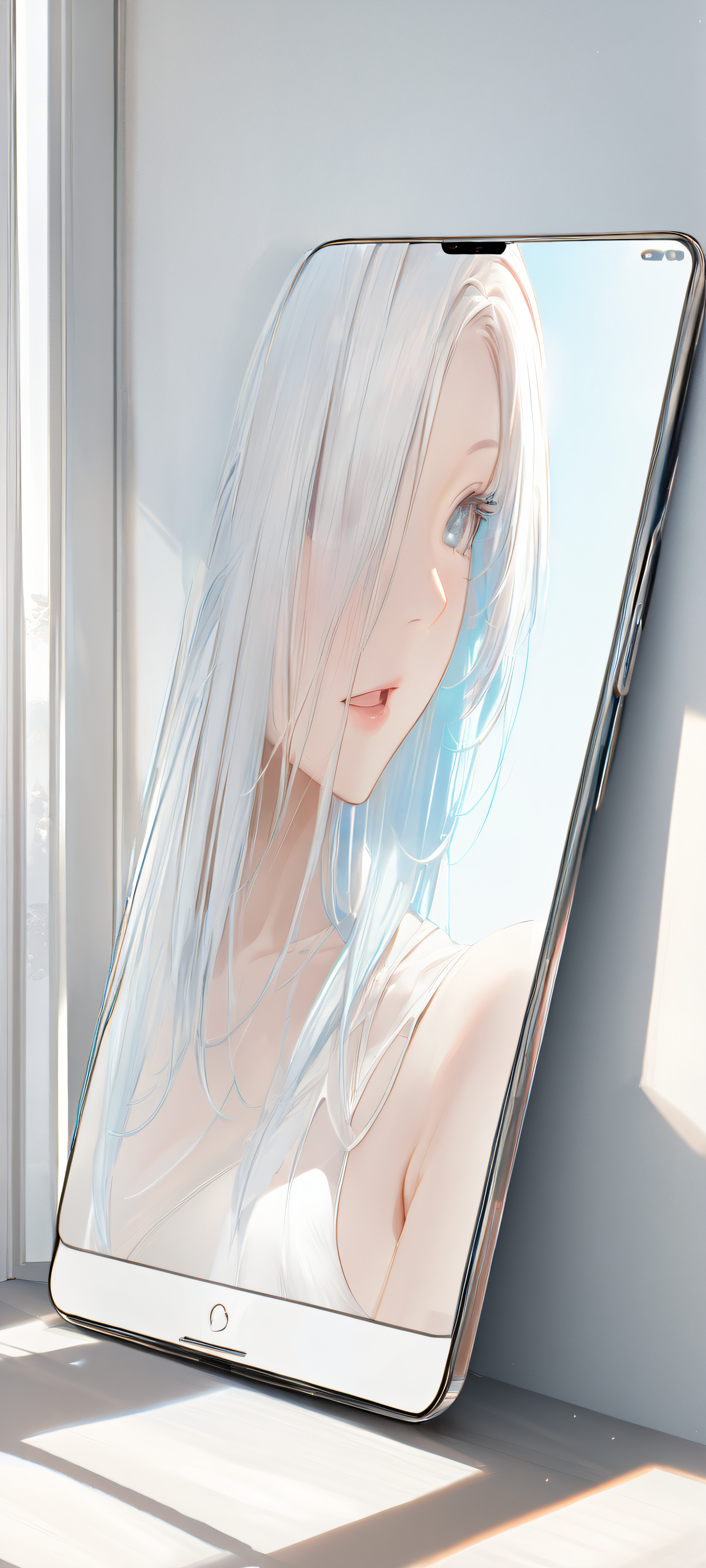A stunning iPhone and Android wallpaper featuring a realistic depiction of a masterpiece on a bench in a bright white room, illuminated by soft natural light.