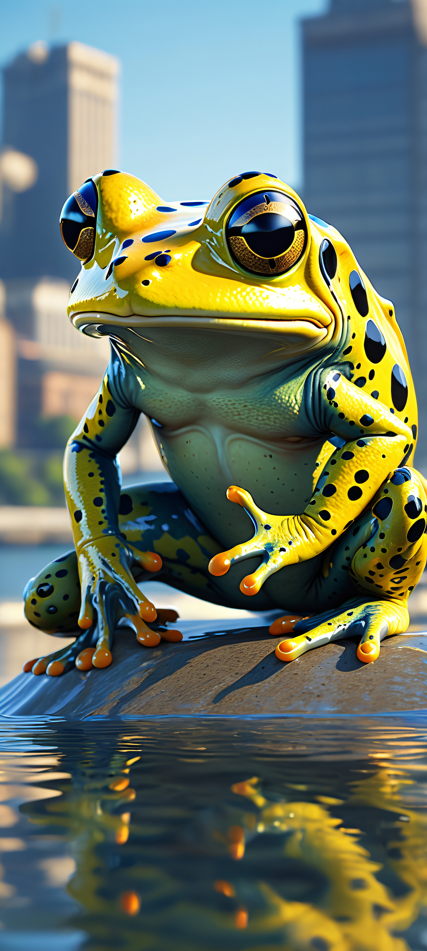 Experience the perfect blend of nature and technology on your perfectly optimized iPhone, Samsung Galaxy, or Android home screen. This stunning portrait of a mechanical frog features intricate details and a serene urban setting, making it an award-winning addition to any mobile wallpaper collection.