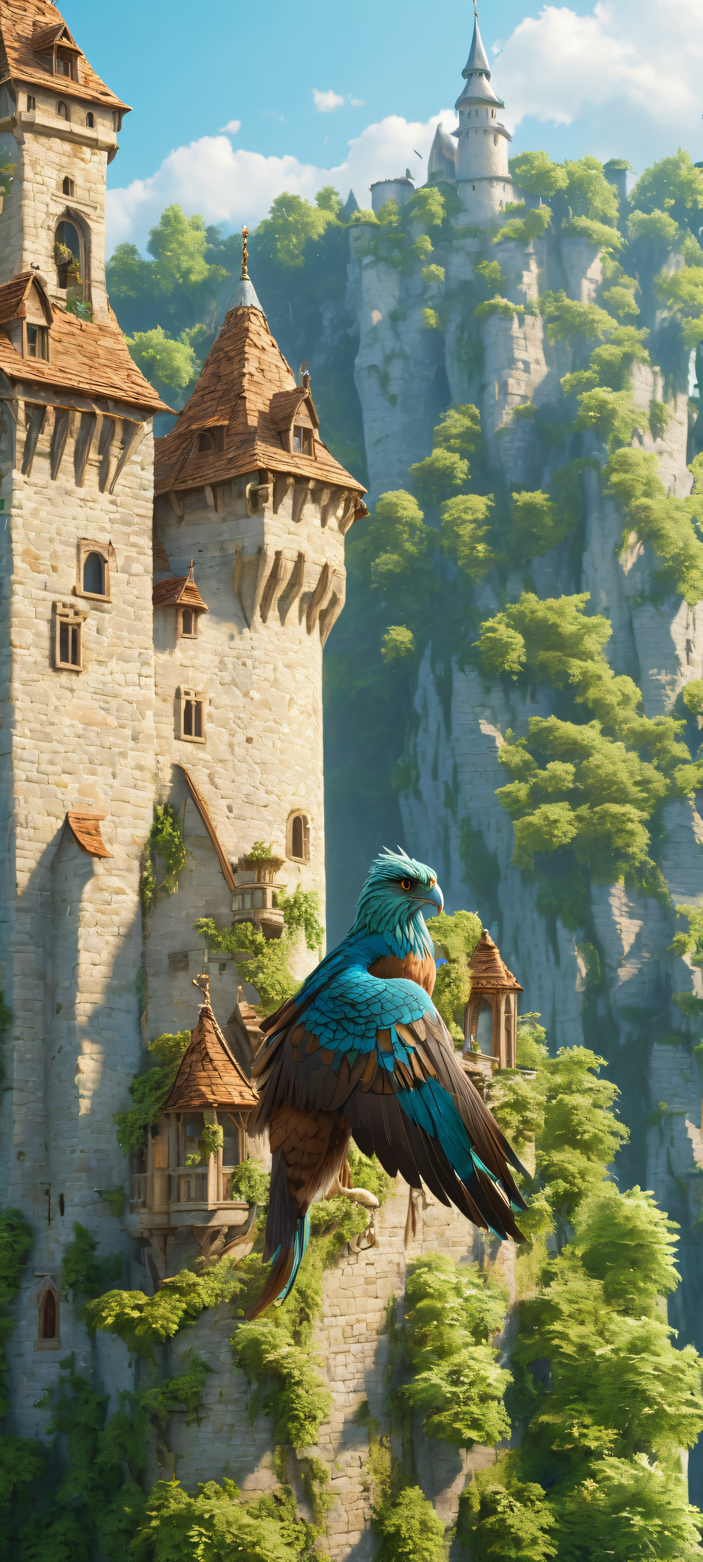 Elevate your mobile phone experience with this breathtaking 2K QHD wallpaper. A majestic harpy takes flight above a medieval castle, surrounded by lush greenery and the warmth of sunlight. This masterpiece is specifically designed to be perfectly optimized for your iPhone, Samsung Galaxy, or Android home screen, ensuring an unparalleled visual experience.