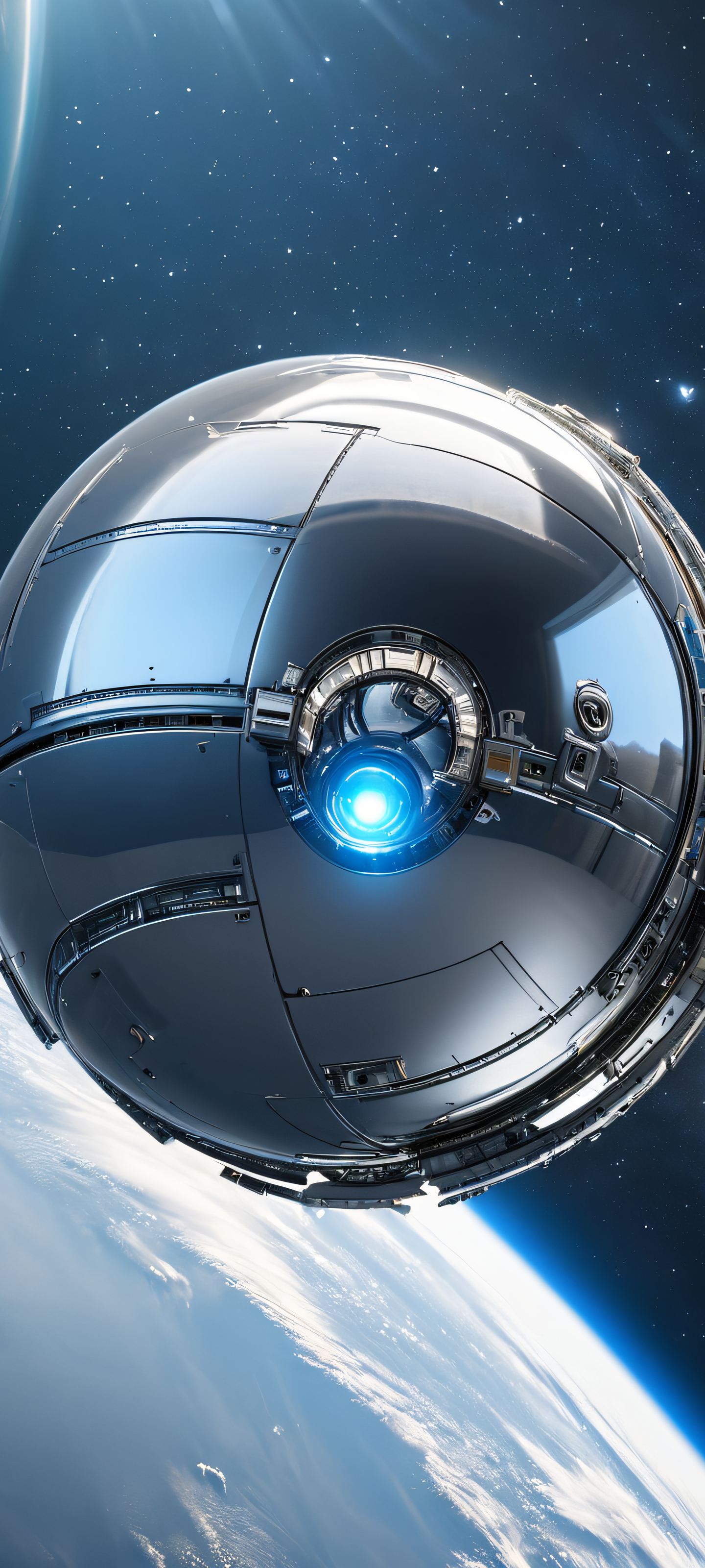 Admire the mesmerizing convergence of metallic orb and space station in this 2K QHD masterpiece. This breathtaking vertical mobile phone wallpaper is meticulously crafted for a seamless fit on iPhone, Samsung Galaxy, and Android home screens, allowing you to experience the sheer wonder of the cosmos up close.