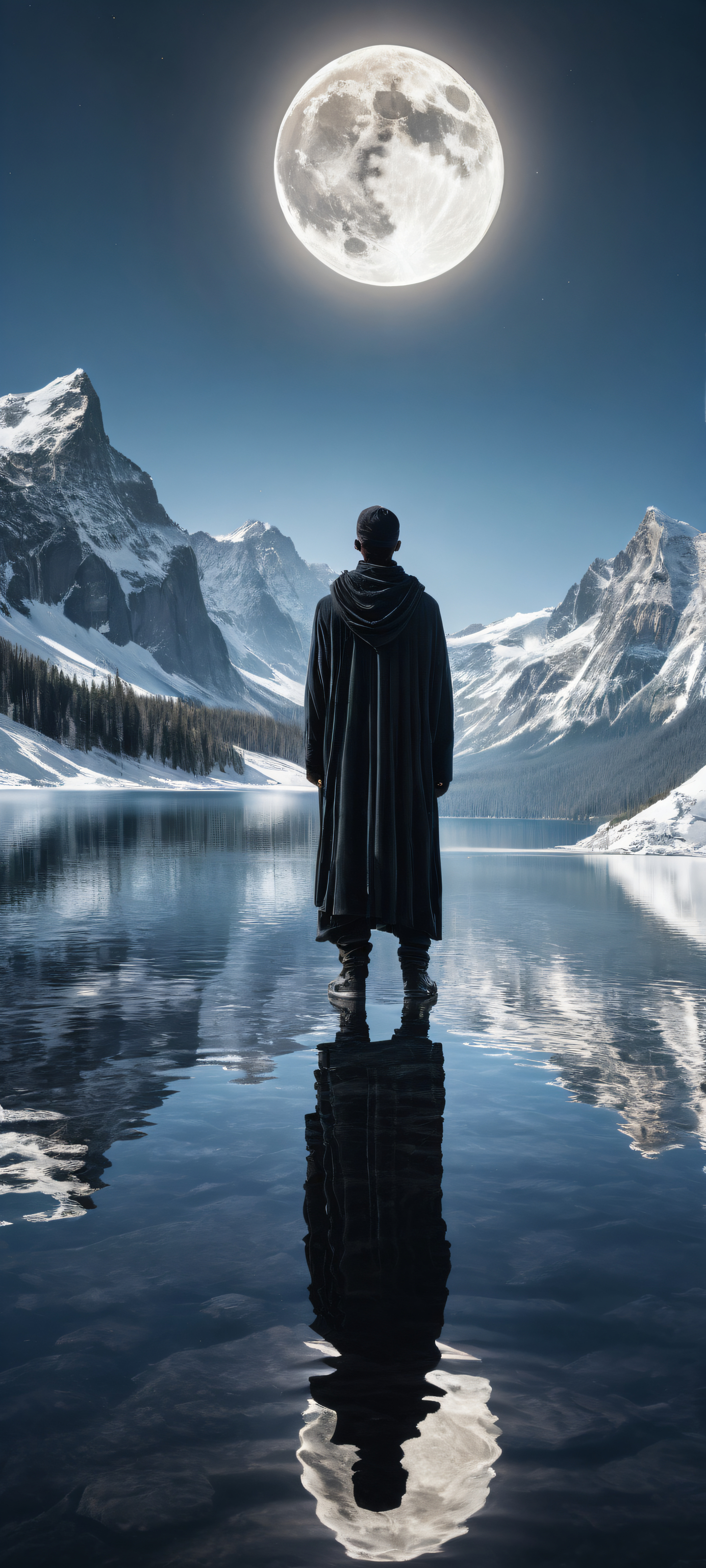 A breathtaking vertical portrait artwork of A massive black eclipse placed in the lower-middle, intricate micro-details of swirling ash-filled clouds, Perfectly clean and empty top half with vast pure void, a dark tattered shroud on the wanderer’s figure, and a smooth reflective frozen lake of black obsidian below, Award-winning digital art, stunning visual impact, and pristine clarity, Ethereal lighting with radiant pale-white corona, ray-traced reflections off the lake, and brilliant ambient light casting no harsh shadows, Dominant color palette: dark blues and grays, accented by intense pale white and deep blacks, ethereal lighting, radiant, brilliant colors, ray traced reflections, pristine clarity, portrait composition, centered subject in the lower middle, perfectly clean and smooth top half for UI, extreme depth of field blurred background, highly textured surfaces, intricate micro-details, physically based rendering, award-winning digital art, epic breathtaking scale, stunning visual impact, perfect composition, macOS wallpaper aesthetic, masterpiece, 2K QHD resolution, 9:20 aspect ratio.