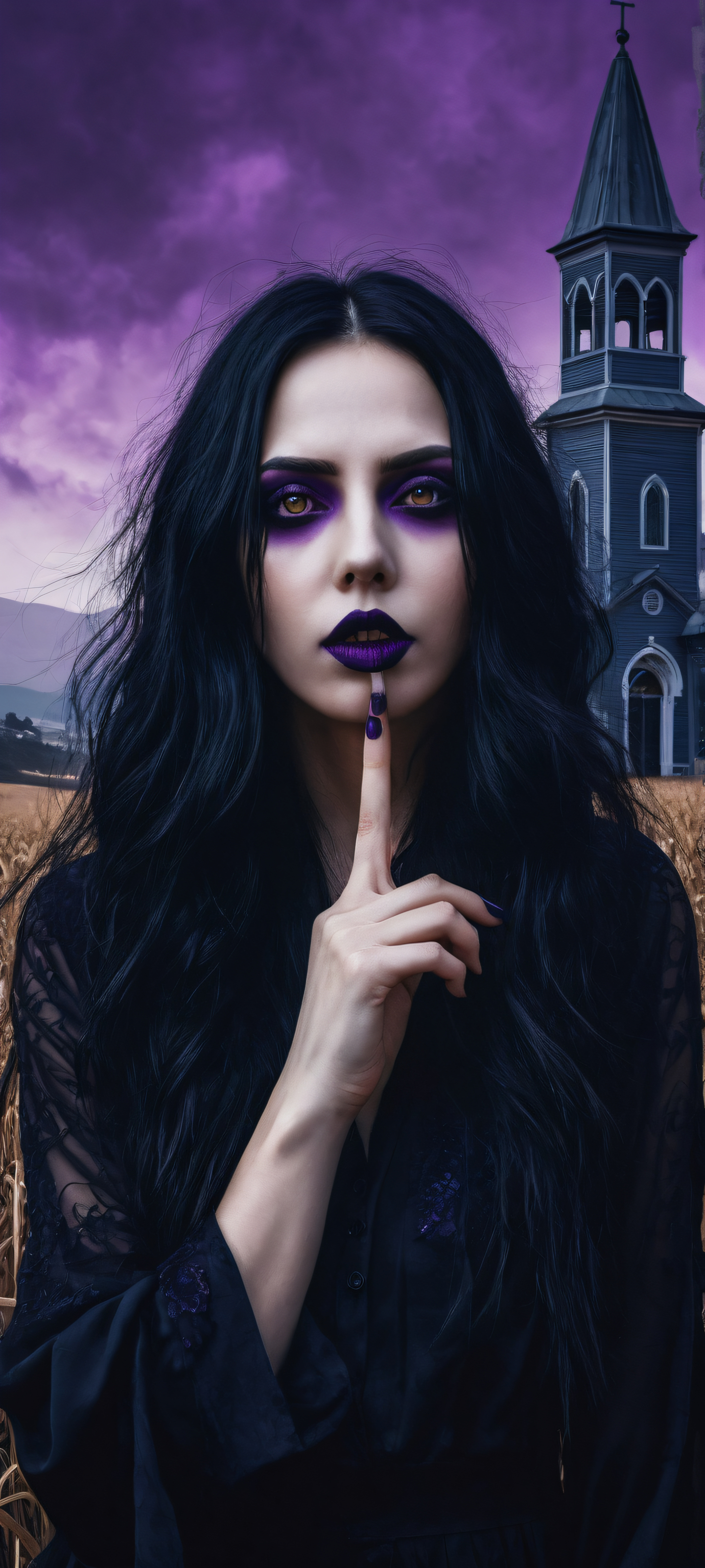 A breathtaking vertical portrait artwork of A young goth woman with long black hair poses with her finger to her mouth, her eyes obscured by a glitched and blurred censor bar. She is placed in the lower-middle of the composition with insane micro-details., Perfectly clean and empty top half with vast pure void. Below, a dark and mysterious landscape unfolds, featuring a terrifying glitched scarecrow amidst a purple haze across a field and an old black church in the LA backdrop., Award-winning digital art, pristine clarity, and a blend of abstract surrealism. The brushstrokes are masterfully blended and sophisticated, creating a sense of depth and intrigue., Dark mode aesthetic with deep perfect blacks, striking crisp contrast, and elegant luminescent accents, evoking a sense of eeriness and mystery. No cinematic lighting effects are used., The dominant color palette is a dark and muted blend of purples, blues, and blacks, reminiscent of the style of horror cinema., elegant low-key lighting, deep perfect blacks, striking contrast, sleek dark mode aesthetic, luminescent accents, deep rich colors, portrait composition, centered subject in the lower middle, perfectly clean and smooth top half for UI, extreme depth of field blurred background, highly textured surfaces, intricate micro-details, physically based rendering, award-winning digital art, epic breathtaking scale, stunning visual impact, perfect composition, macOS wallpaper aesthetic, masterpiece, 2K QHD resolution, 9:20 aspect ratio.