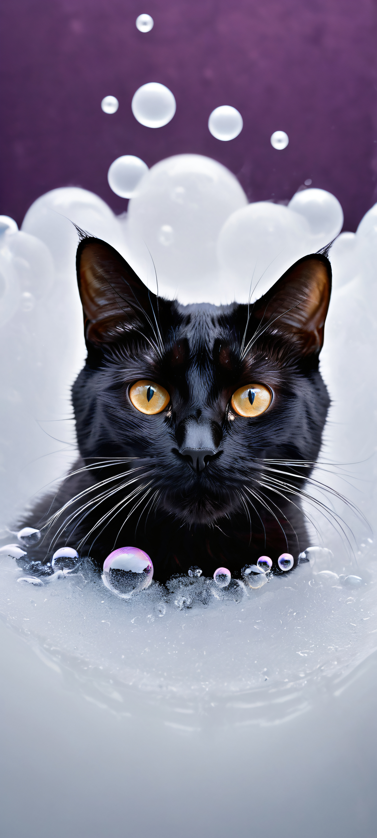 Step into the mystique of this breathtaking digital art masterpiece. Perfectly optimized for your iPhone, Samsung Galaxy, or Android home screen, this stunning visual features a black cat surrounded by an intricate bubble bath, with a vast pure void above. The contrast between the clean top half and the surreal dreamlike atmosphere below creates a sense of enchantment and curiosity.